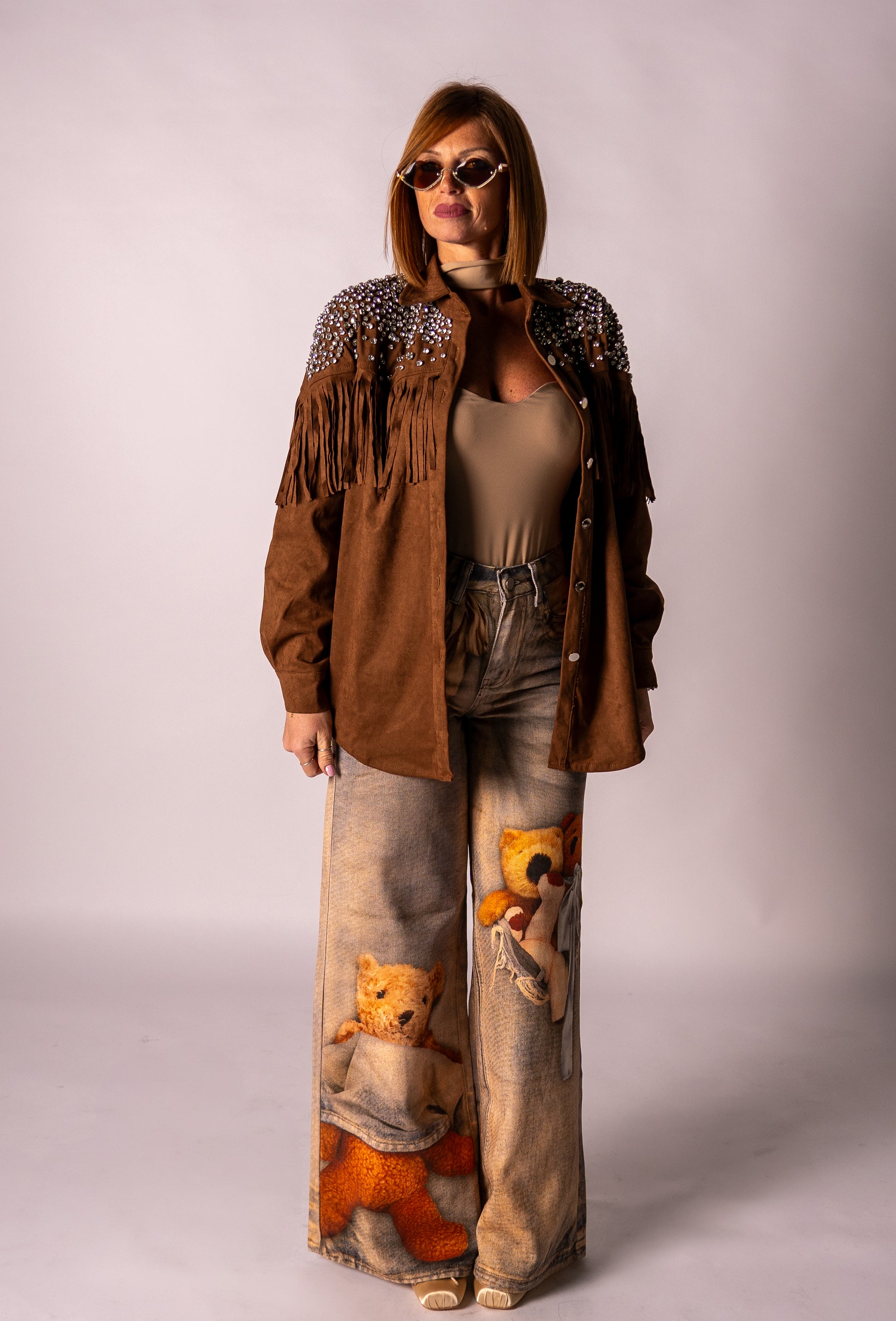 Camicia in camoscio con frange e strass, bottoni a scatto di chiusura!