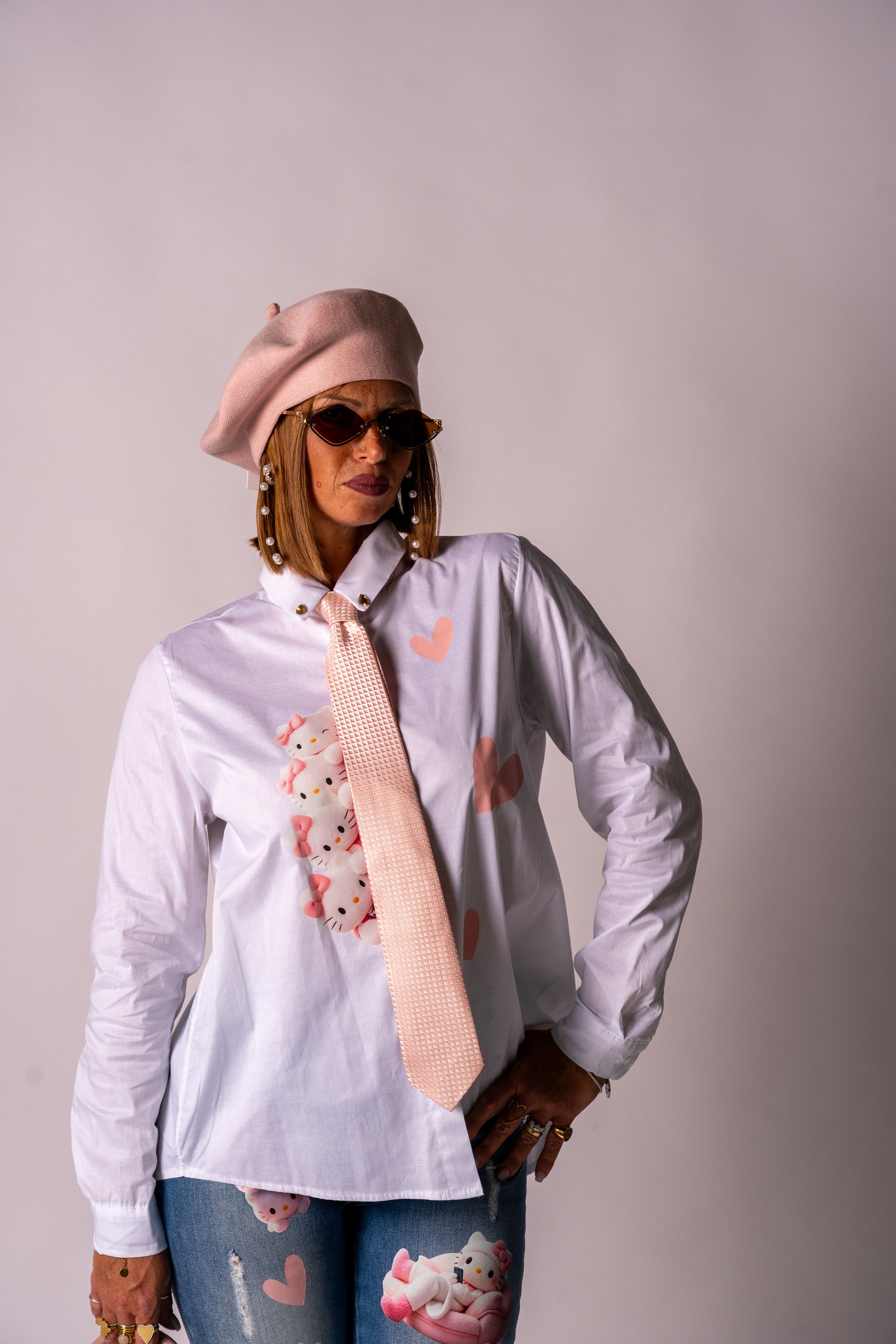 Camicia in cotone con stampe Hello Kitty e dettagli Swarovski Handemade by Sally!