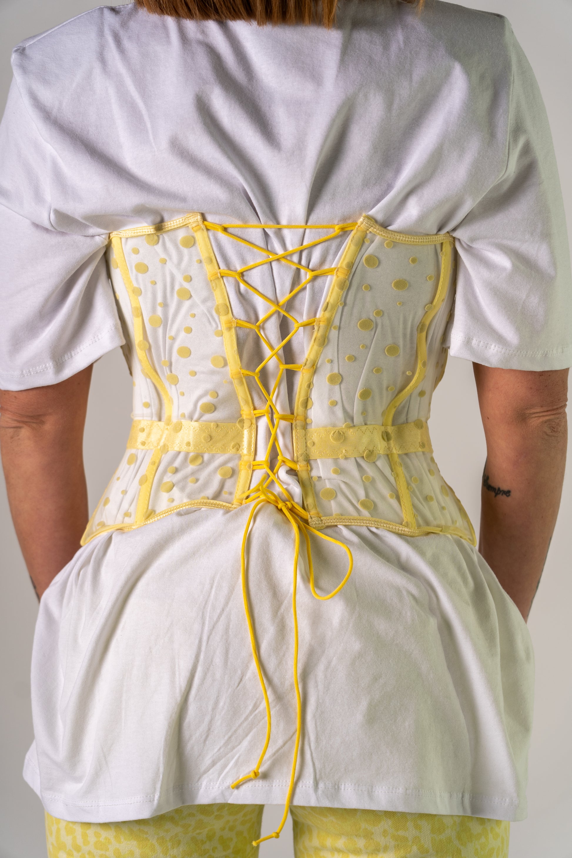 Combo composta da maglia mezzo collo con spalline e corsetto in organza con pois e stringhe sul retro!