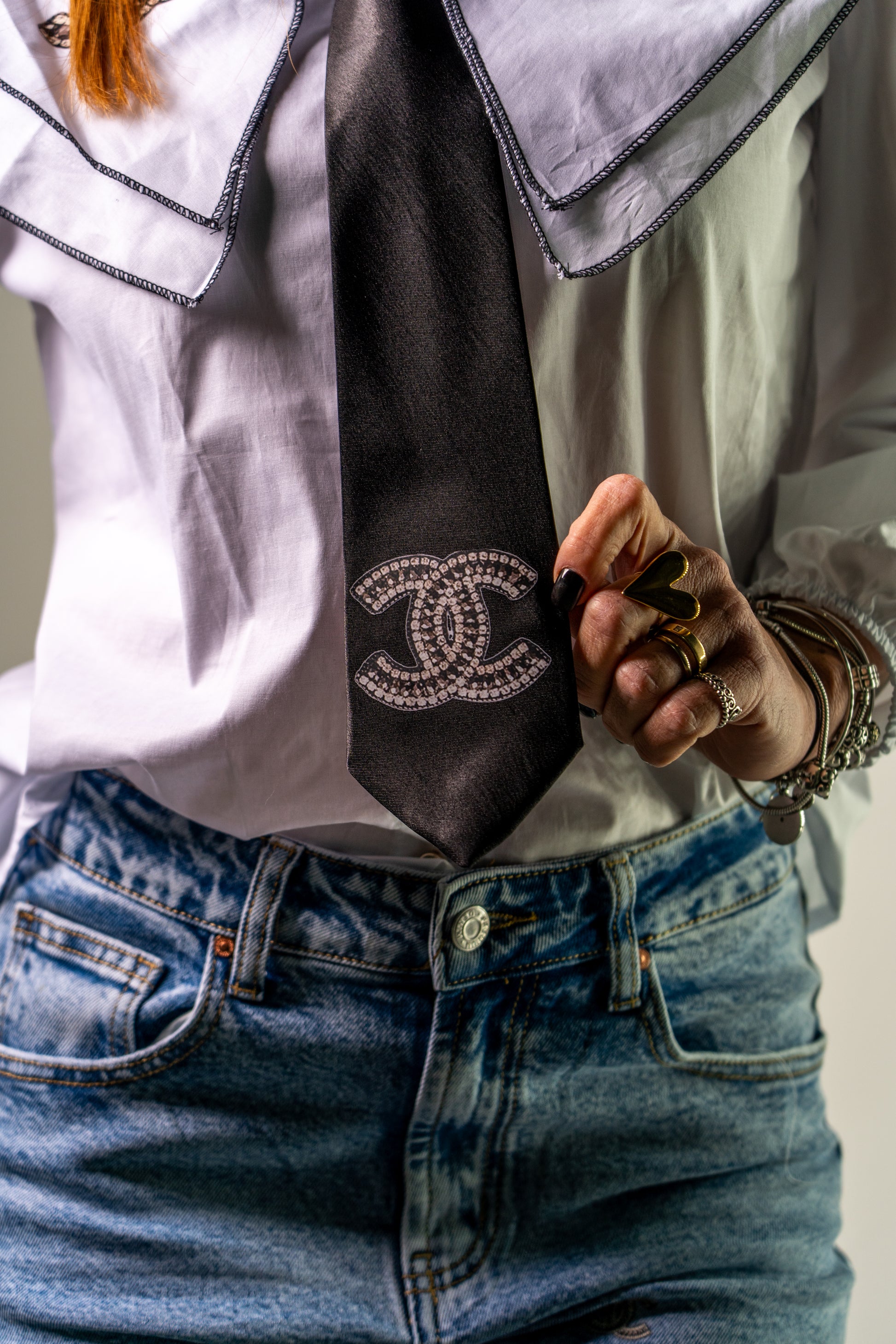 Cravatta in raso nera con stampa c**nel