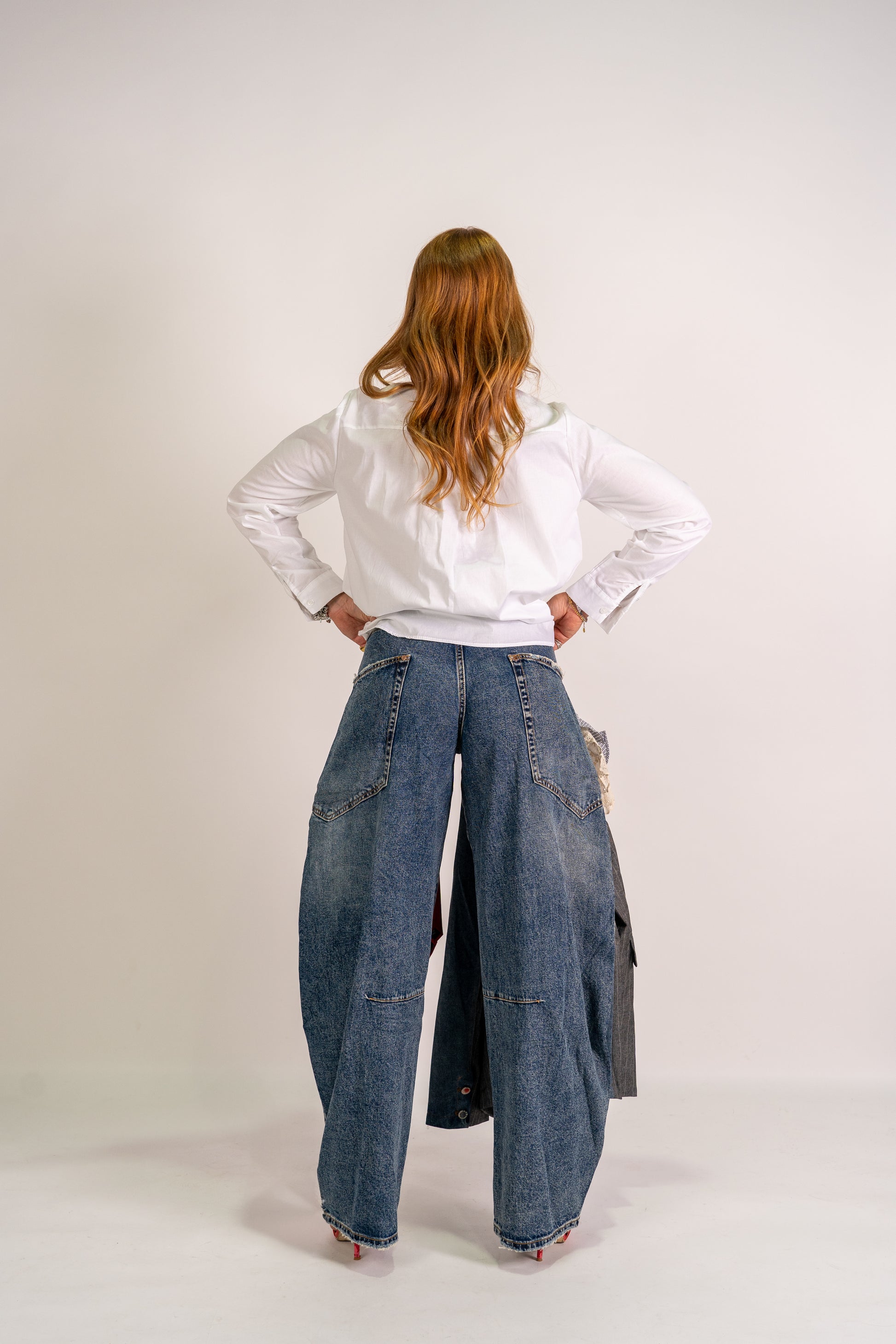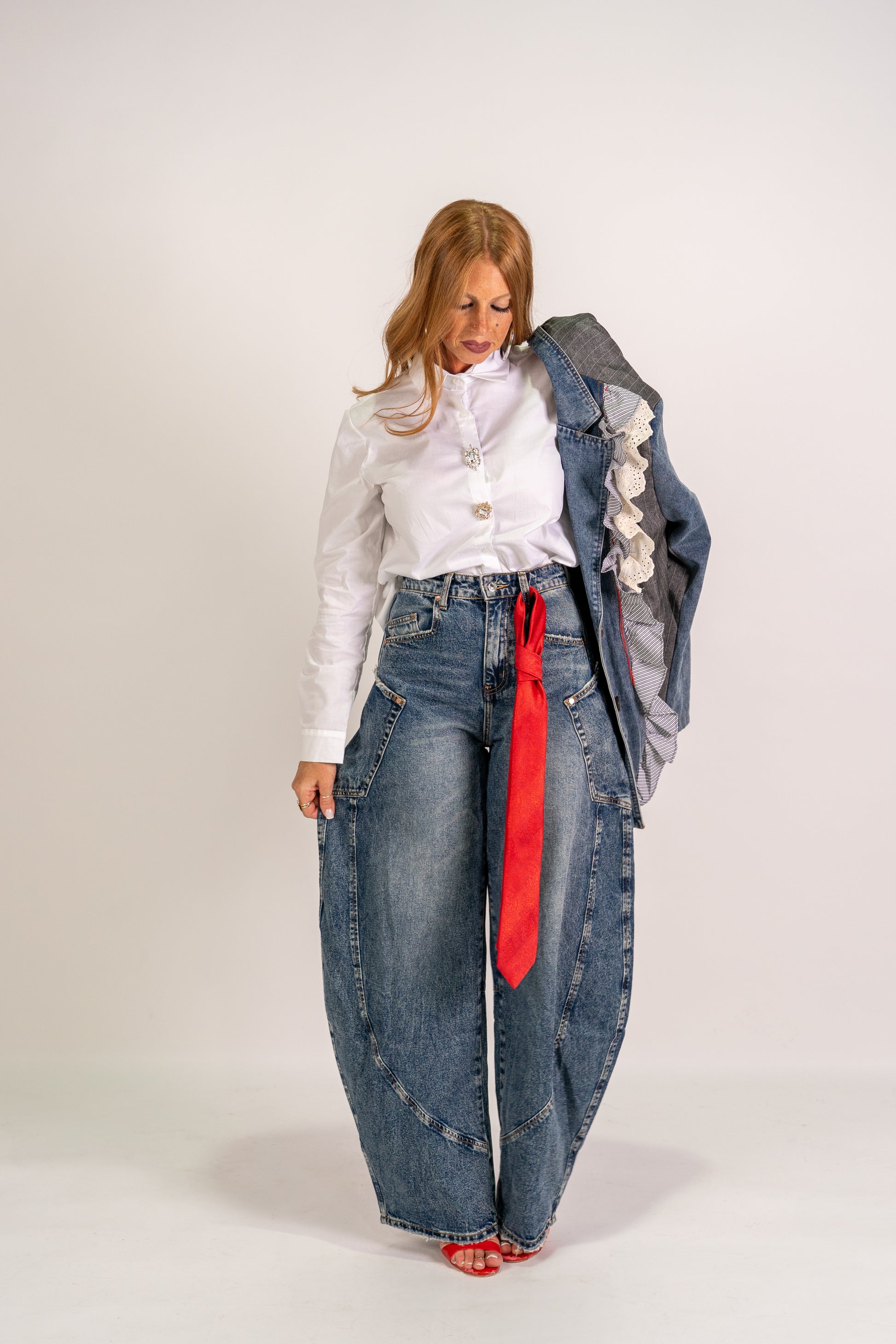 Denim ballon con tasconi laterali, lavaggio scuro, poco elastico.