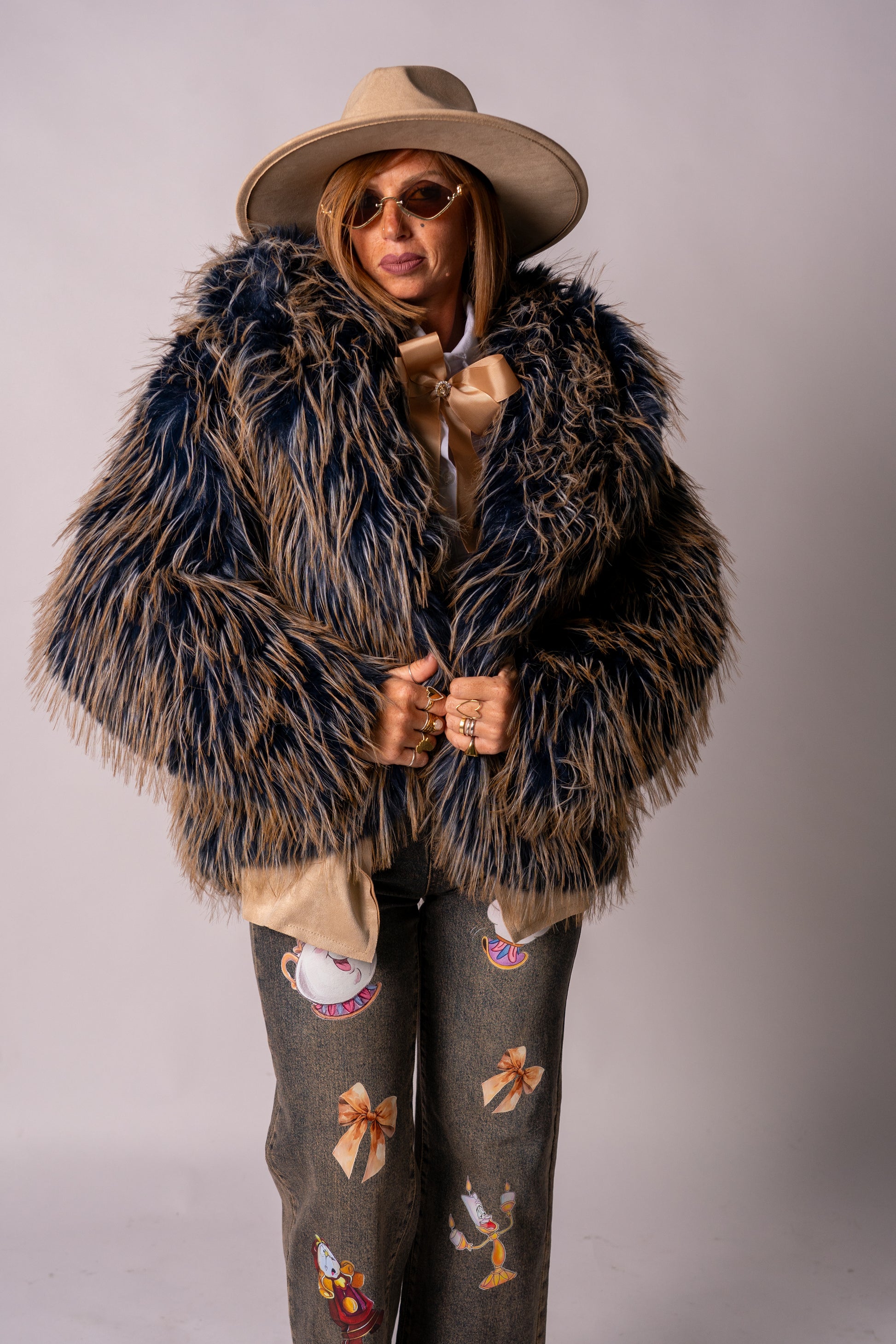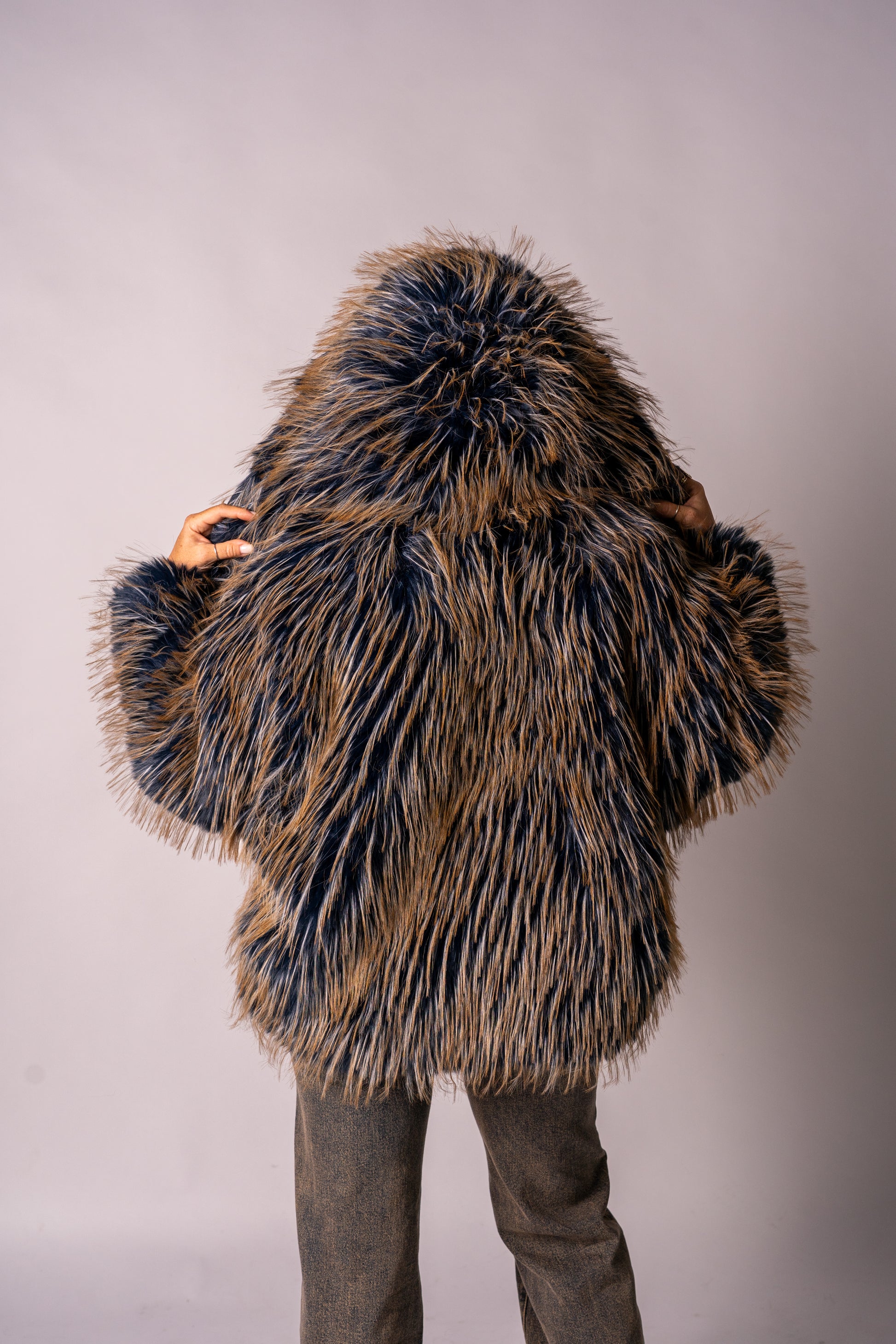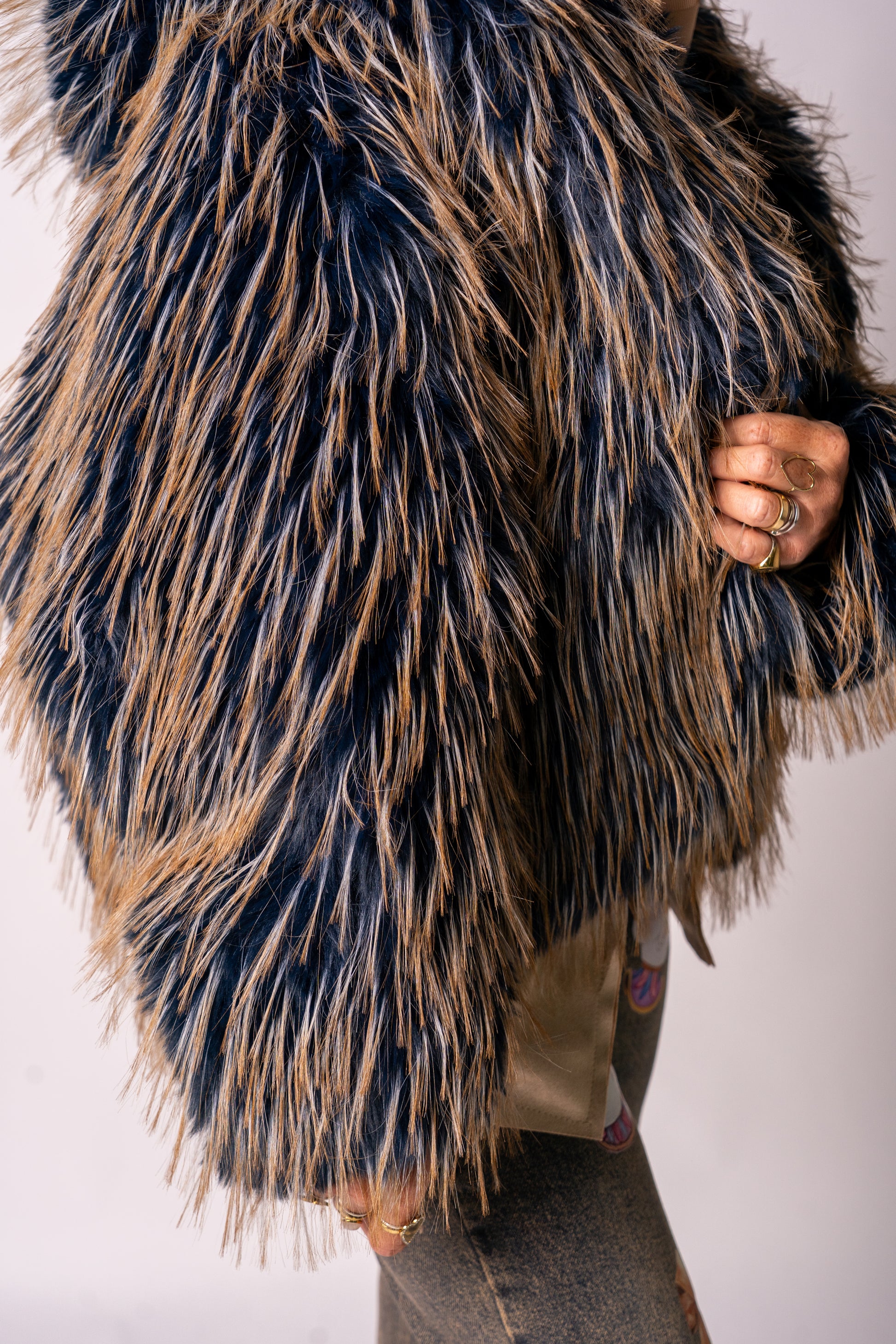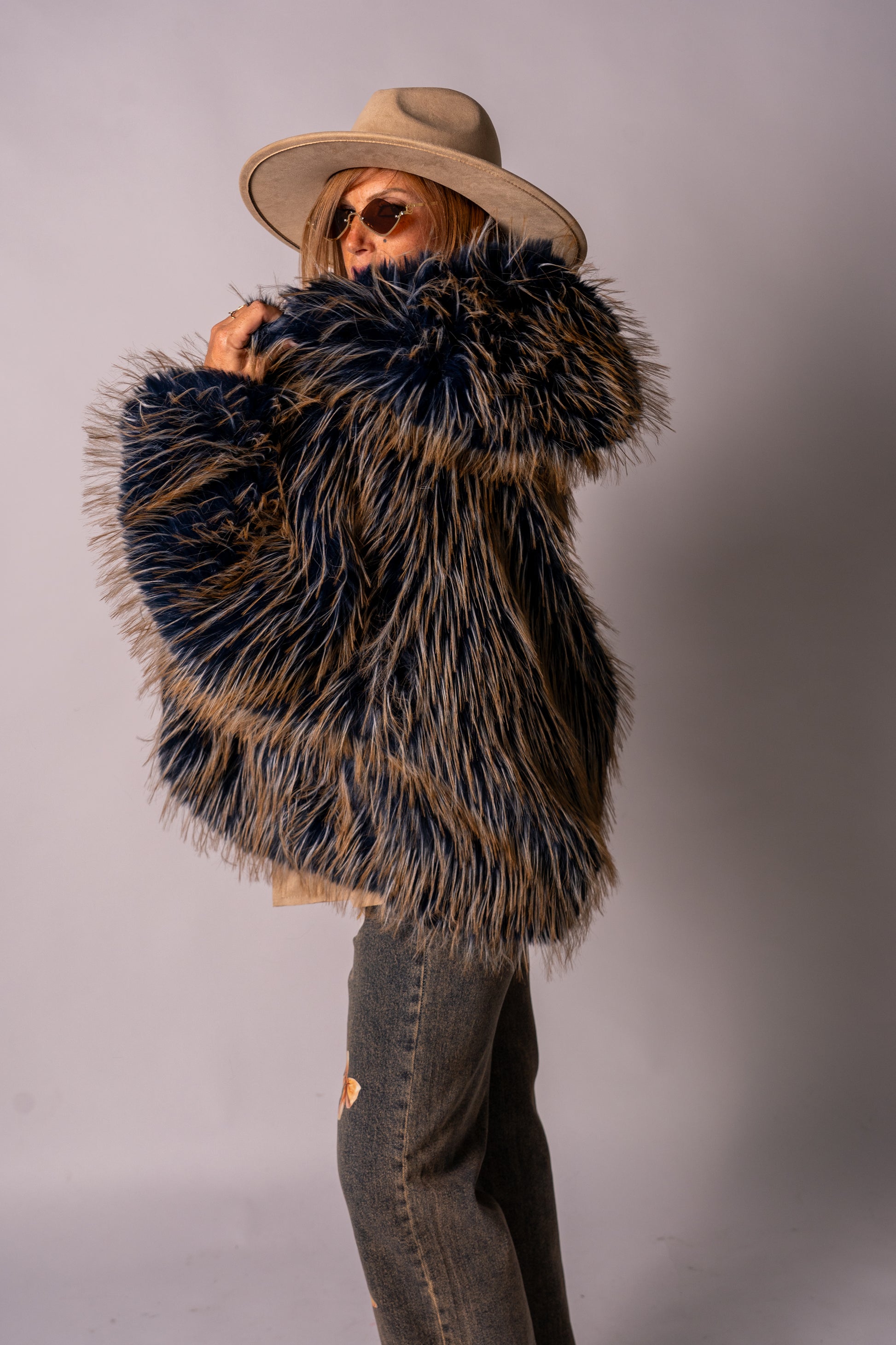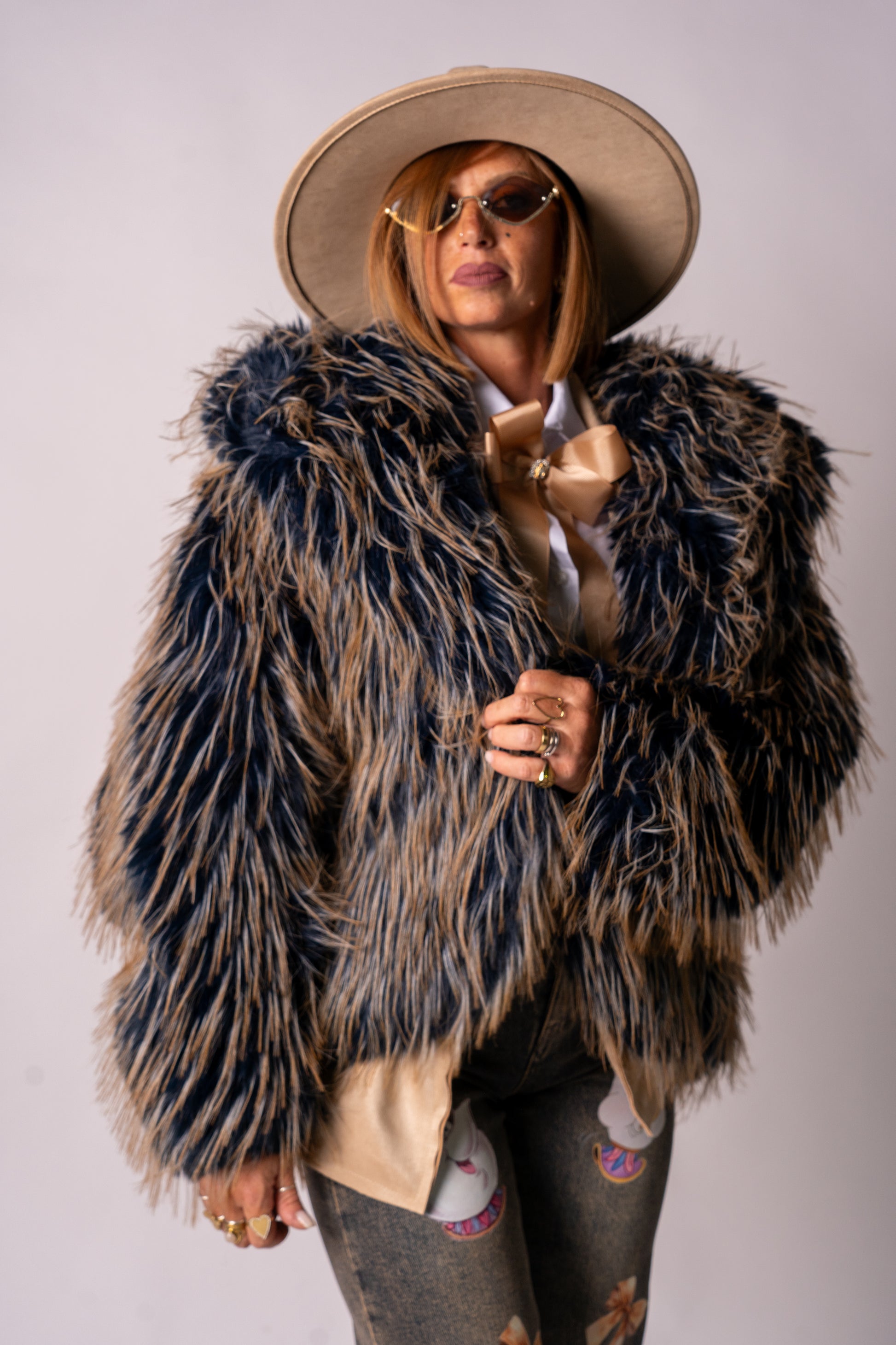 Ecopelliccia blu con cappuccio e chiusura con ciappe!