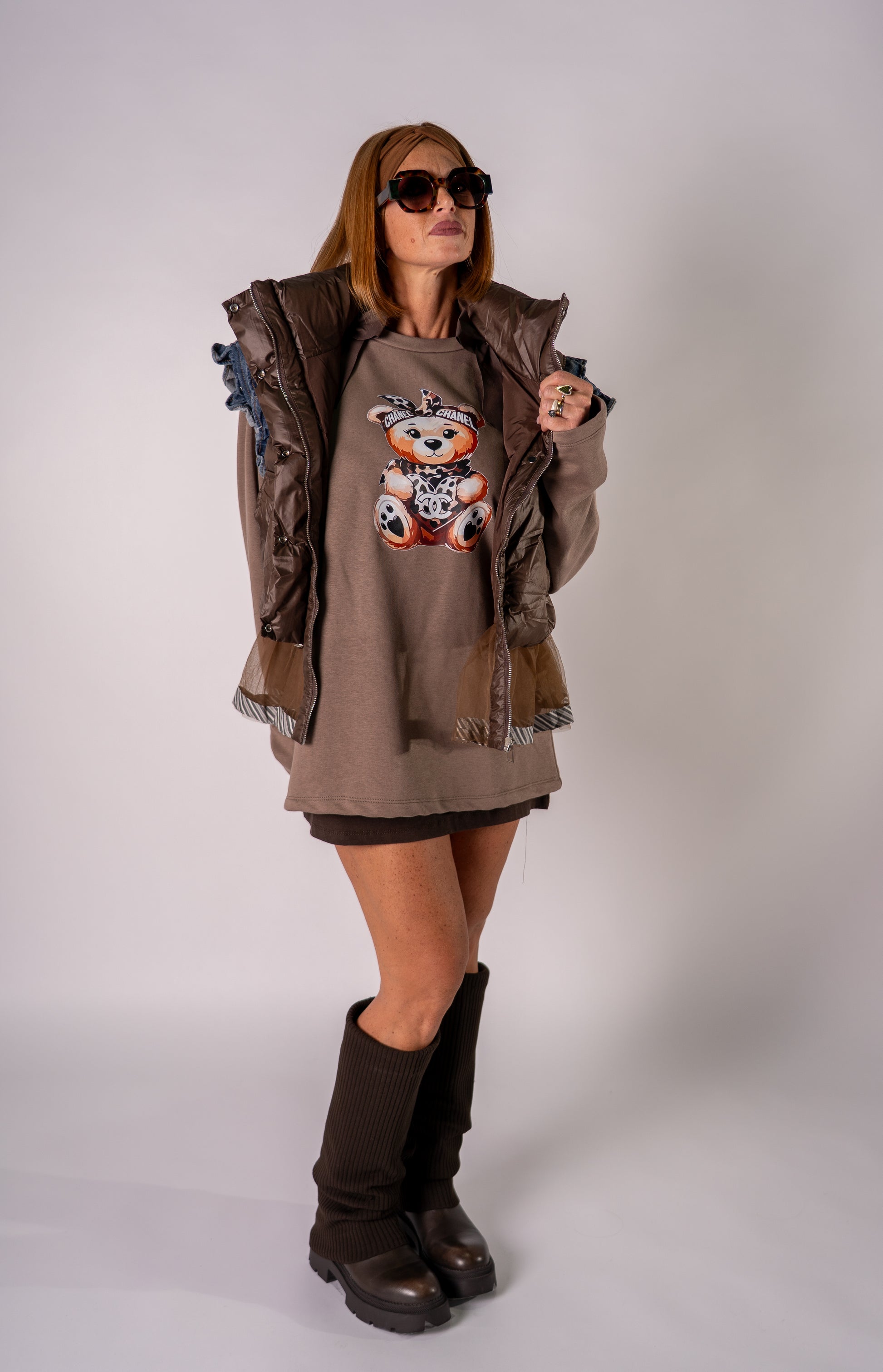 Maxi felpa in cotone con spalline ,stampa orsetto chanel handemade by Sally e dettagli di fiocchi spille!