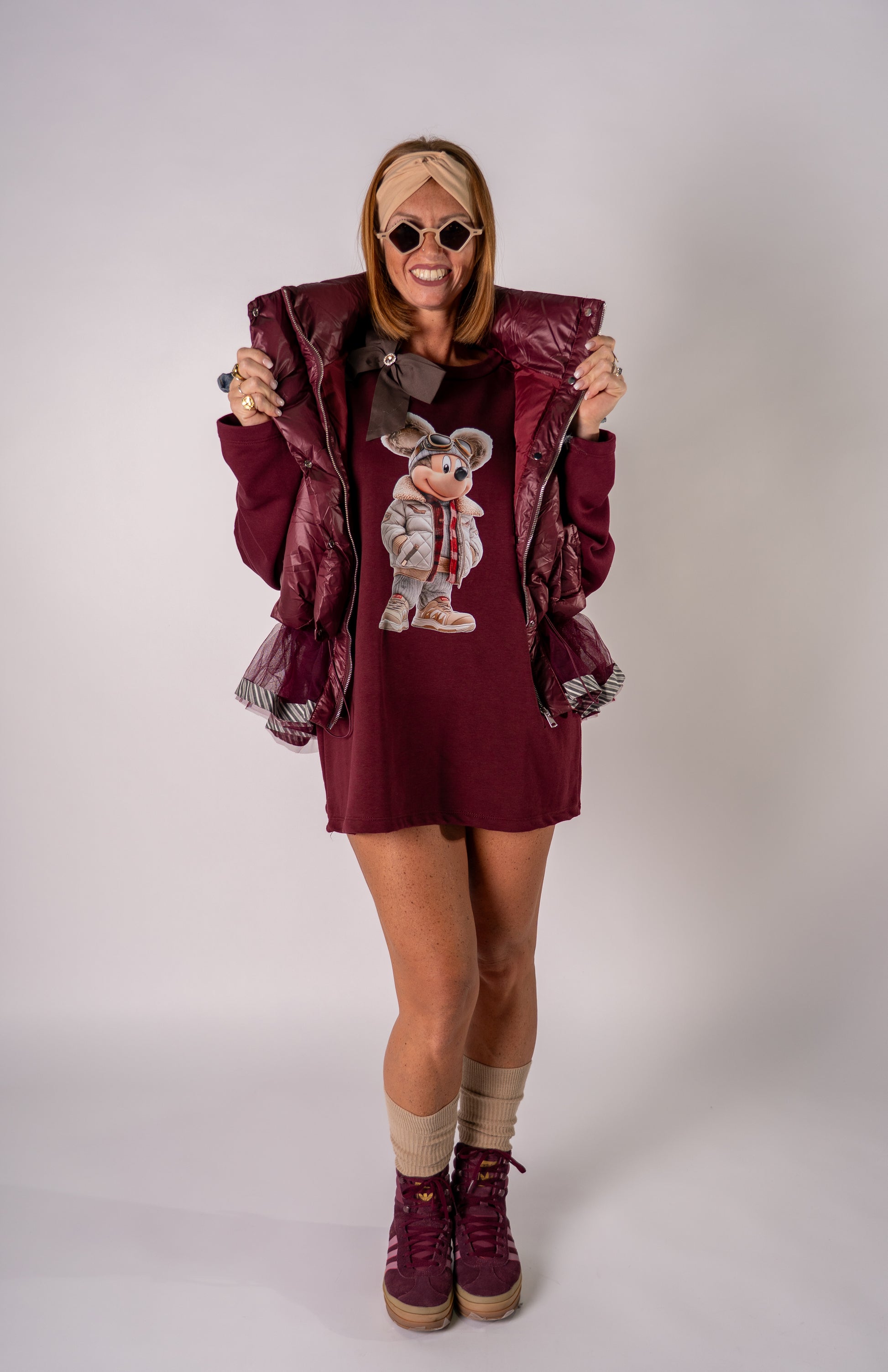 Maxi felpa in cotone con spalline ,stampa MICKEY handemade by Sally e applicazione di fiocco spilla!