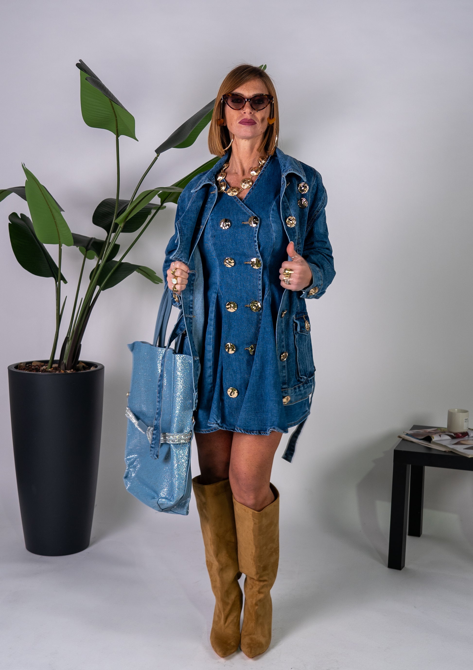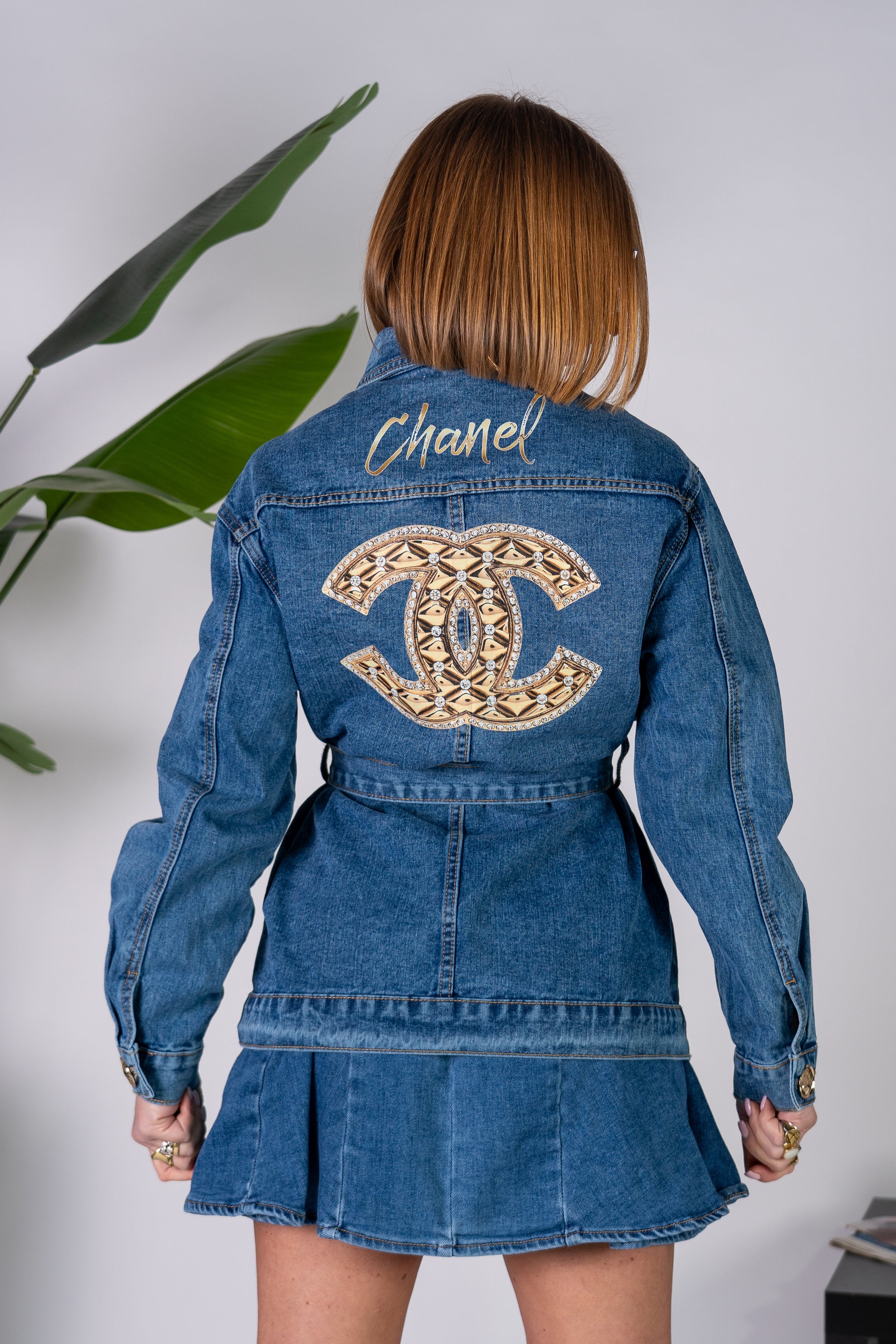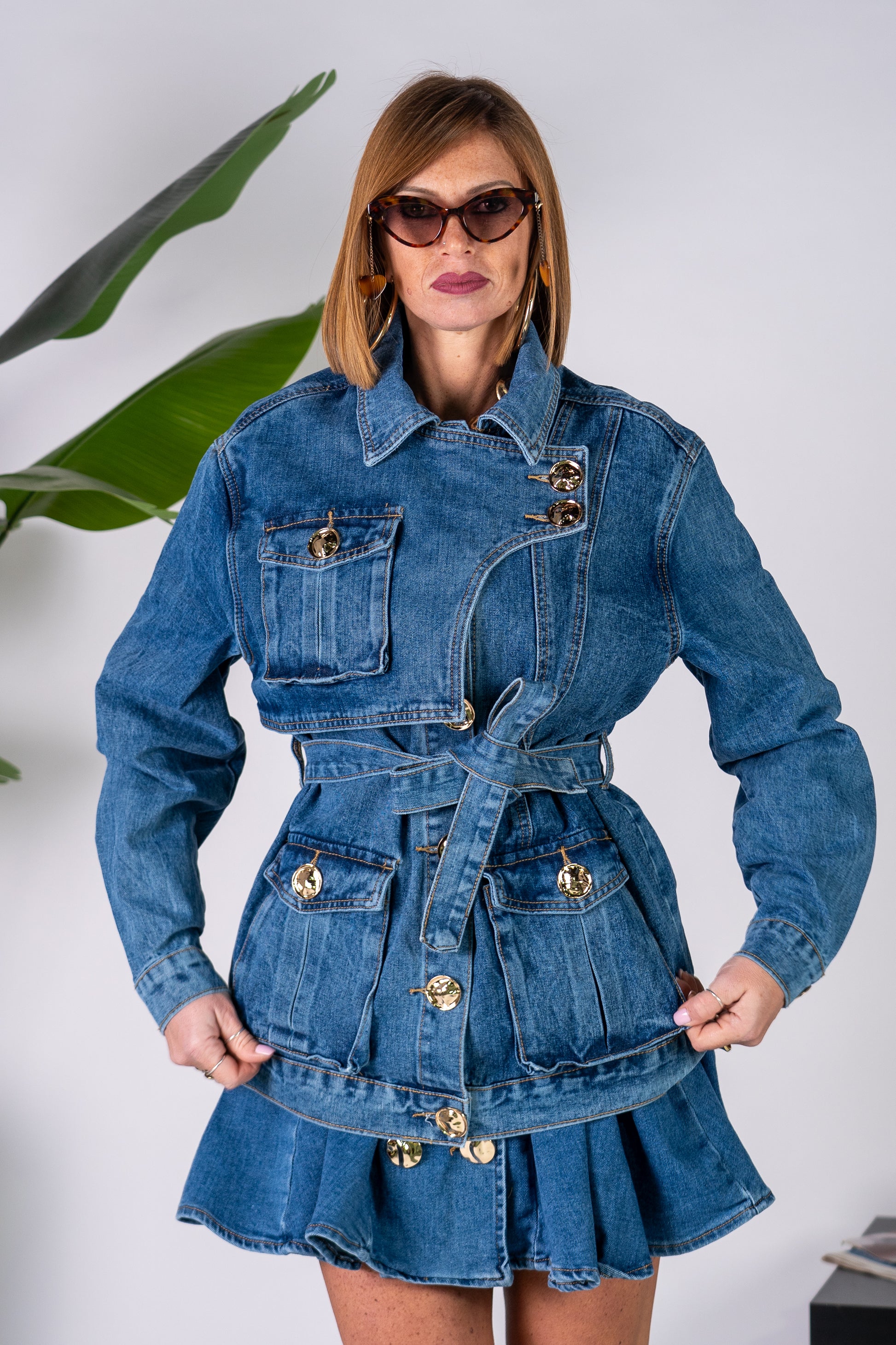 Giacca a Giubbino in denim con abbottonatura doppiopetto, cintura in vita e bottoni oro!