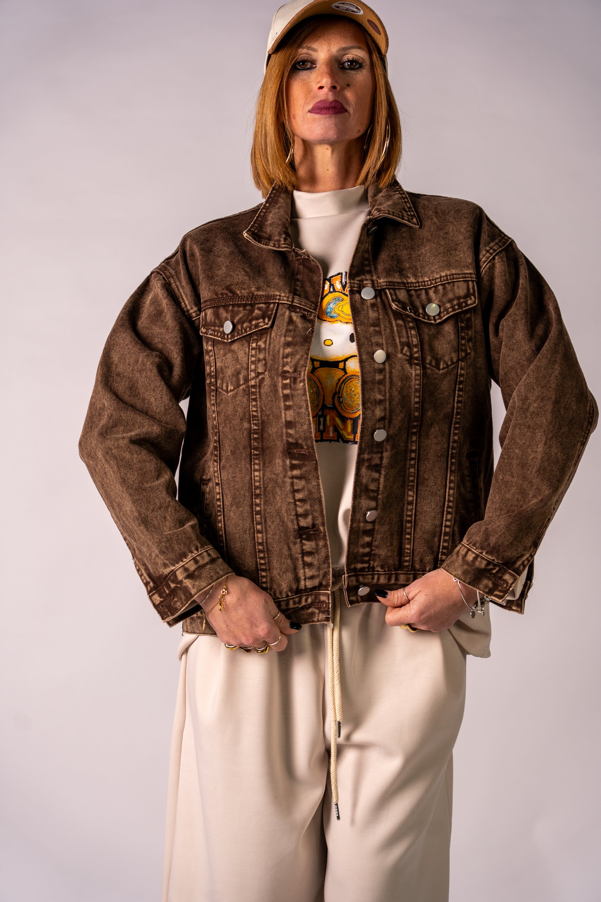 Giubbino in denim marrone bruciato con stampa handemade by Sally!