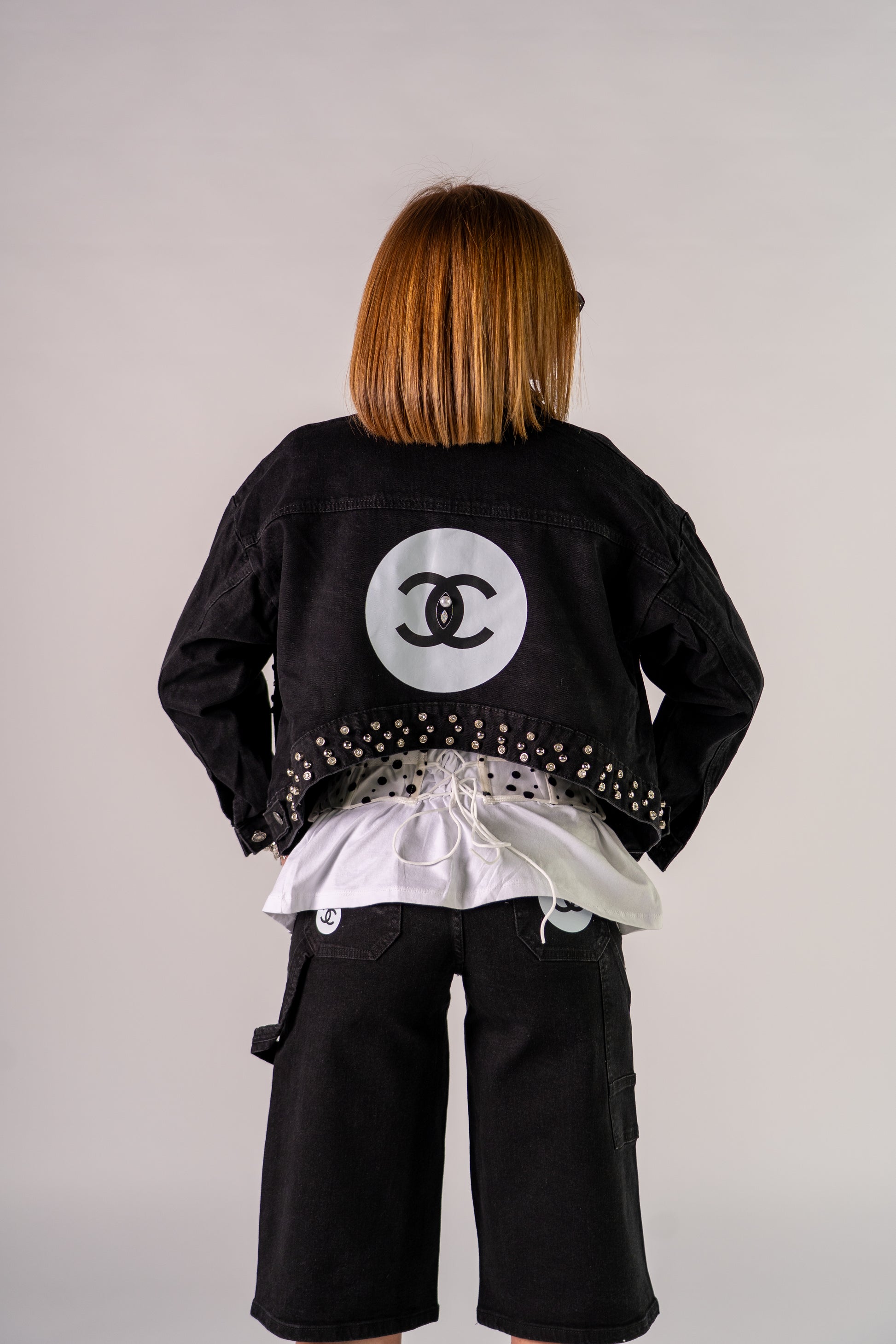 Giubbino in denim nero con applicazioni di borchie e strass e stampa handemade by Sally!