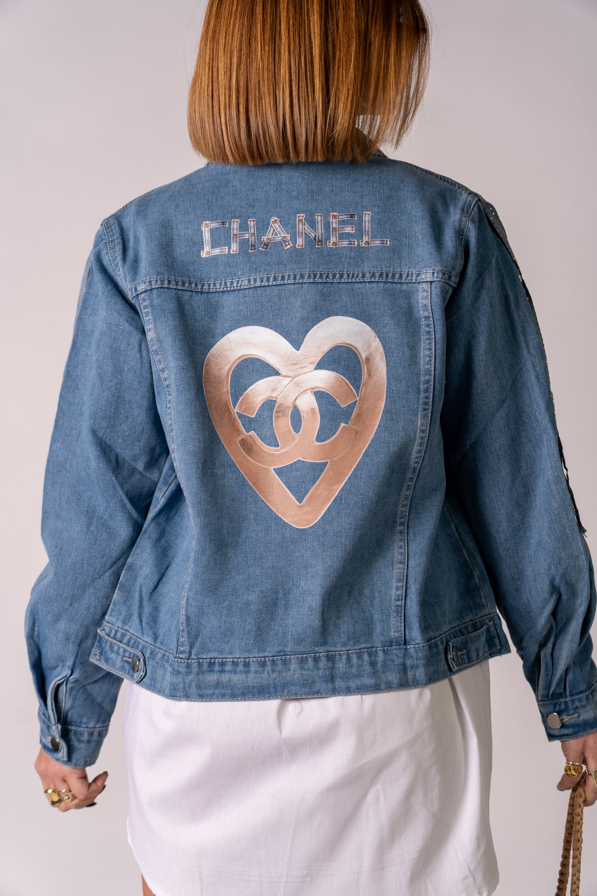 Giubbino denim con frange decorate con strass e stampa handemade by Sally!