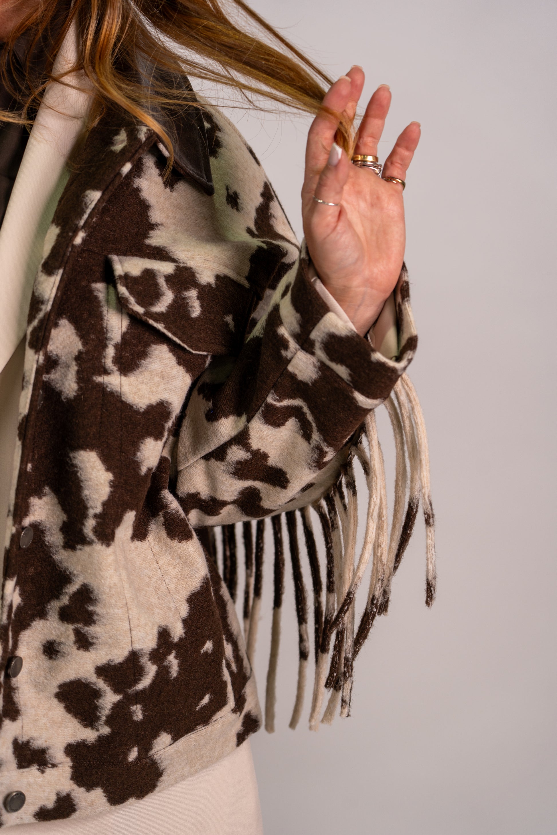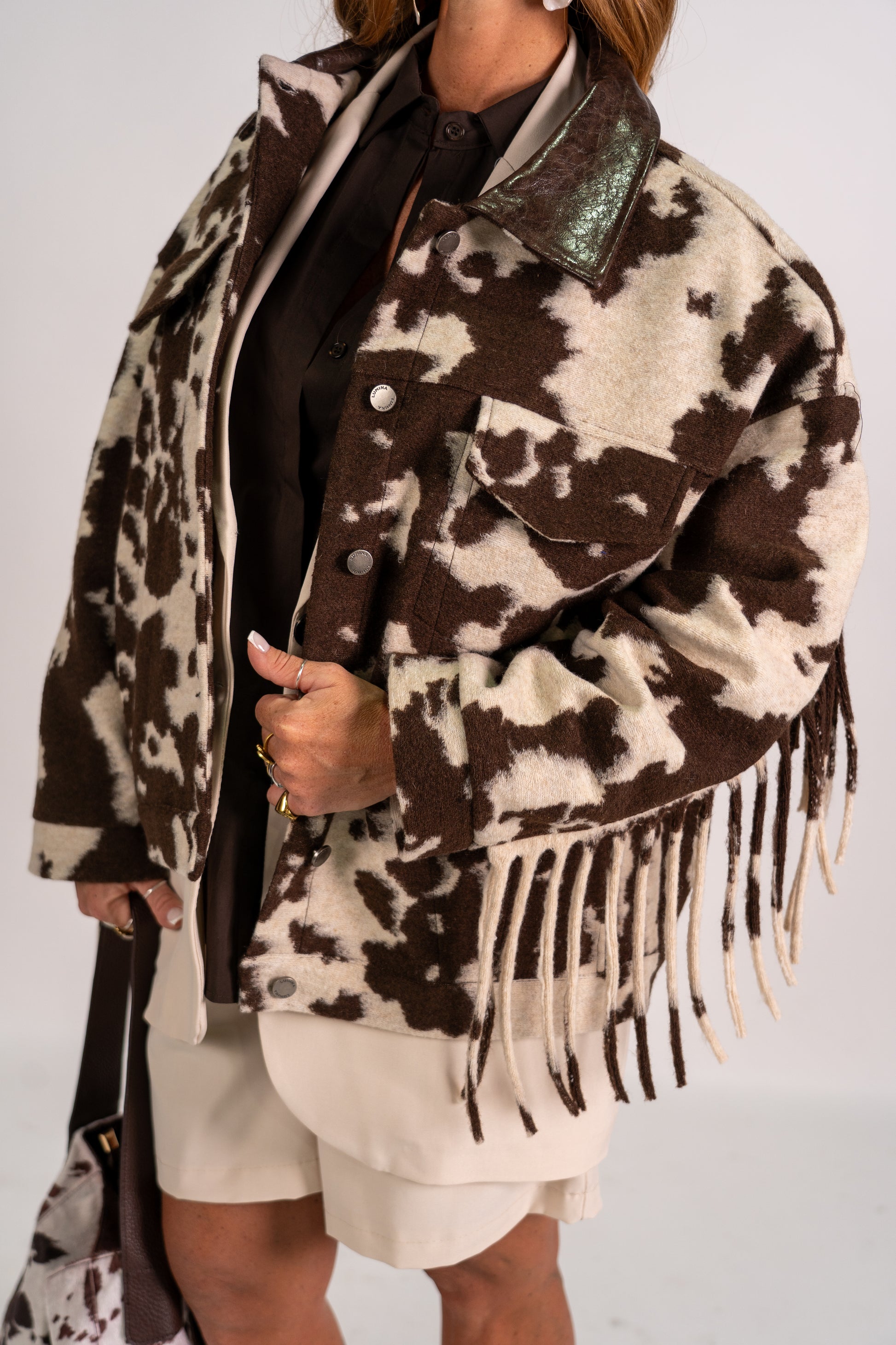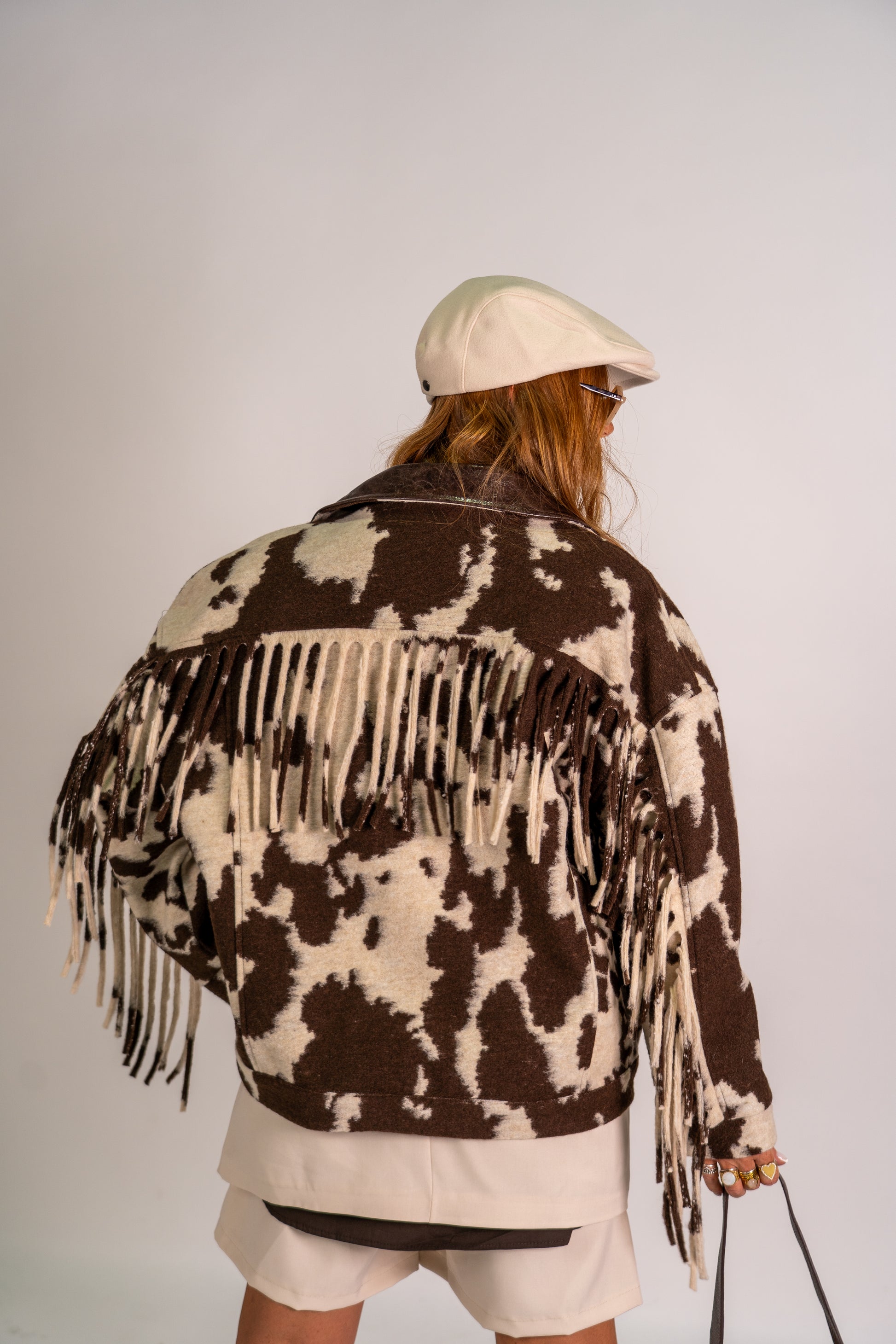 Giubbino LUMINA in panno con frange sul retro, bottoni e colletto in ecopelle