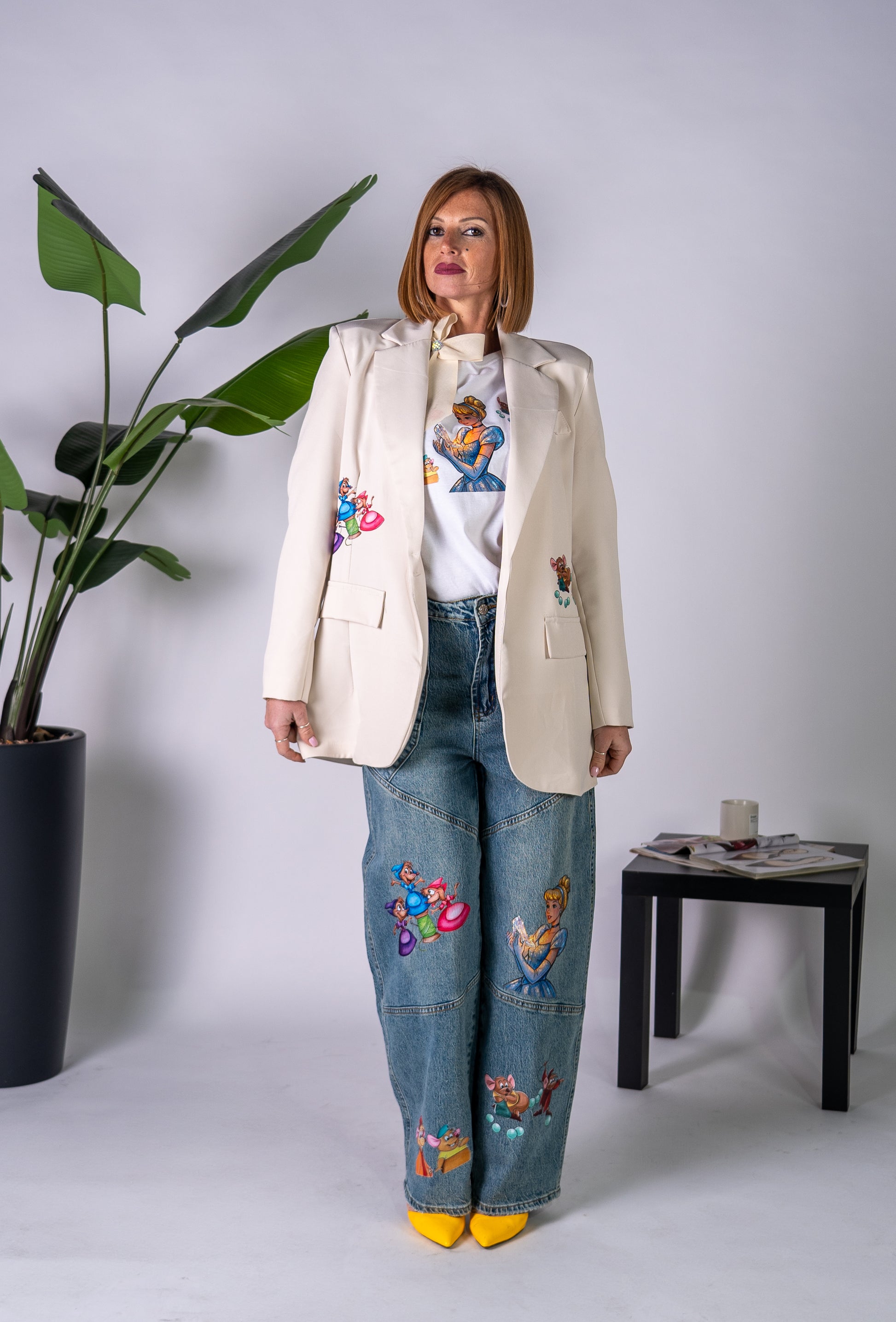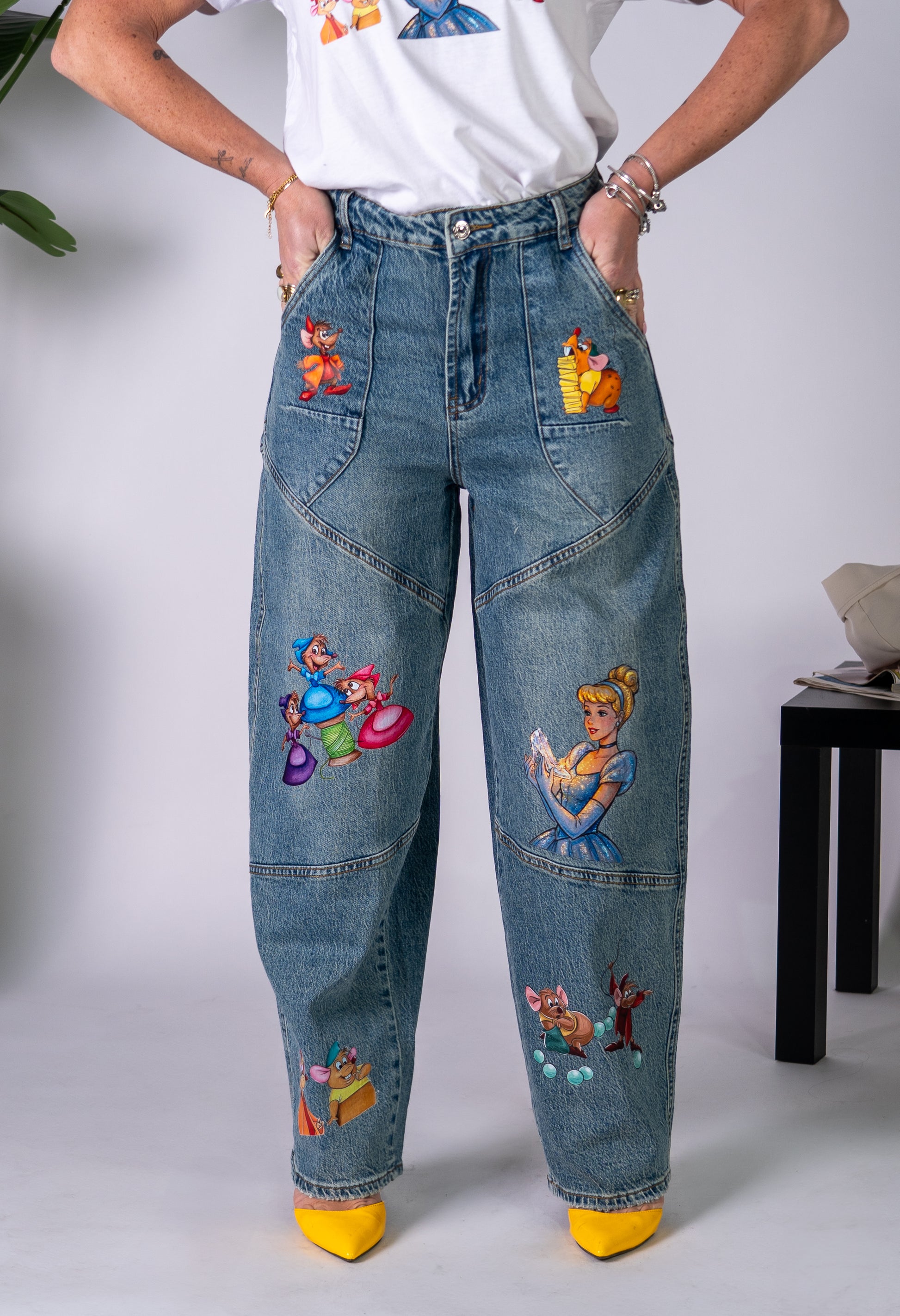 Jeans elastico , lavaggio sfumato, gamba larga e stampe Cenerentola handemade by Sally!