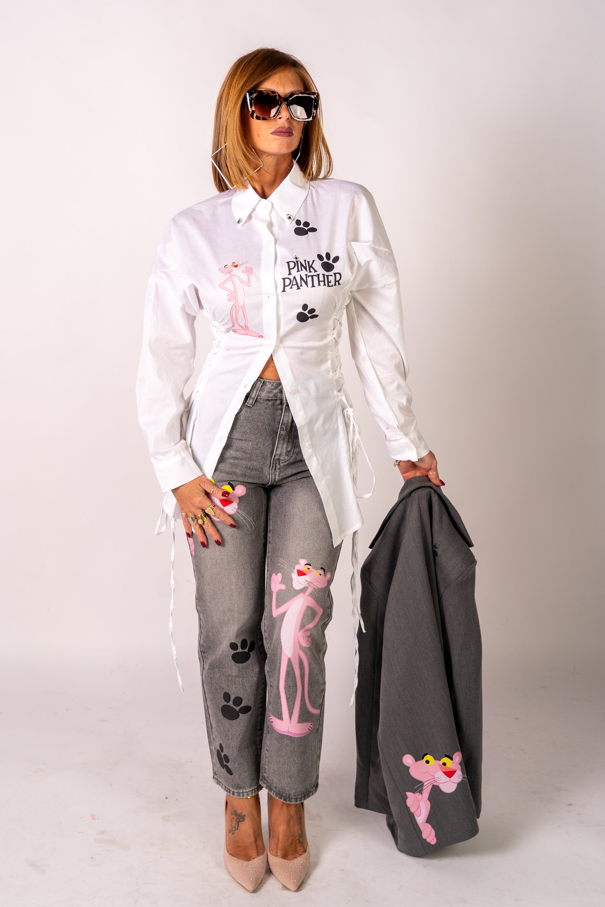 Jeans grigio vita alta modello push up con stampe PINK PANTHER handemade by Sally!