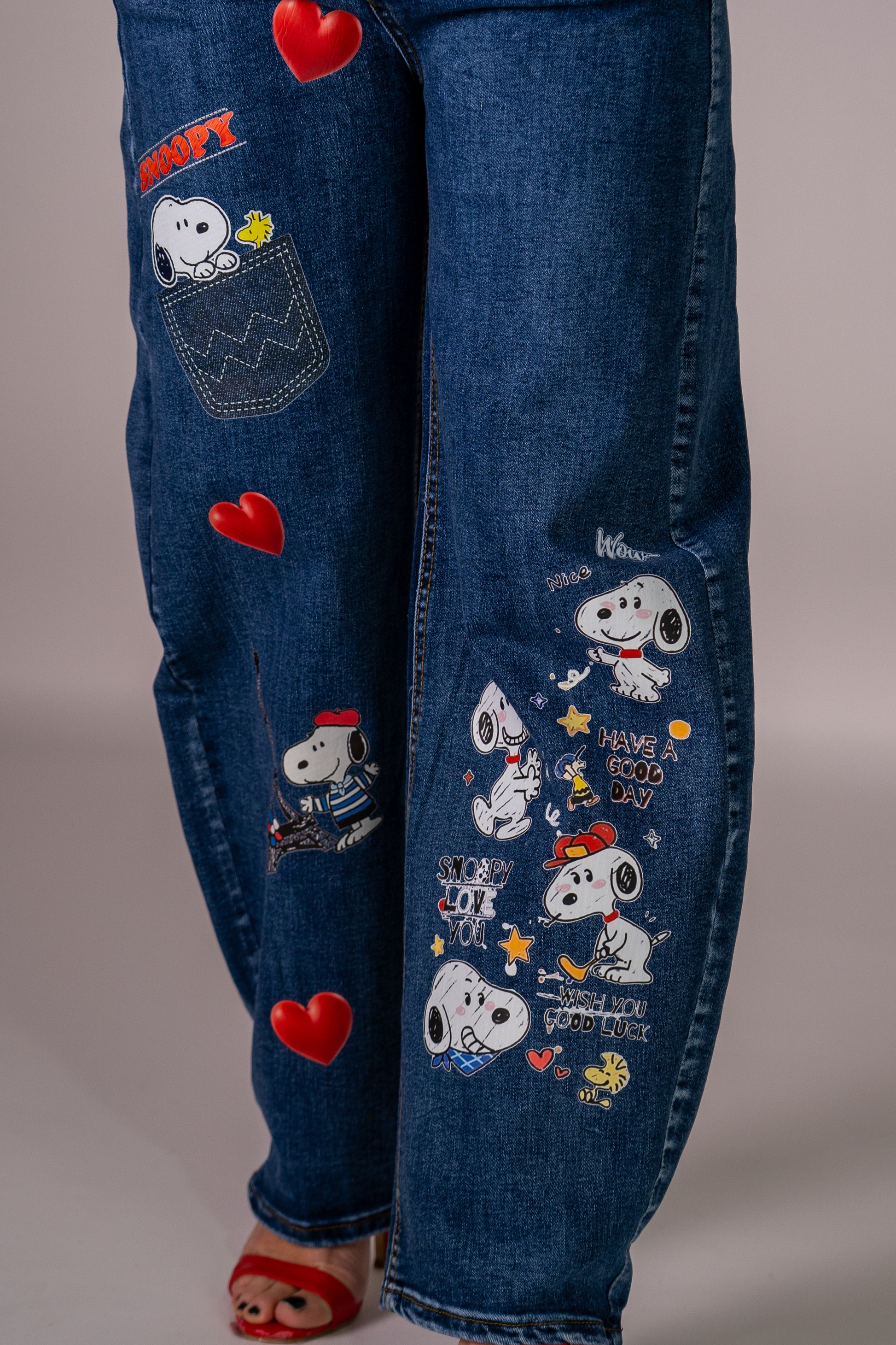 Jeans elastico, modello balloon lavaggio scuro con stampe Snoopy handemade by Sally!
