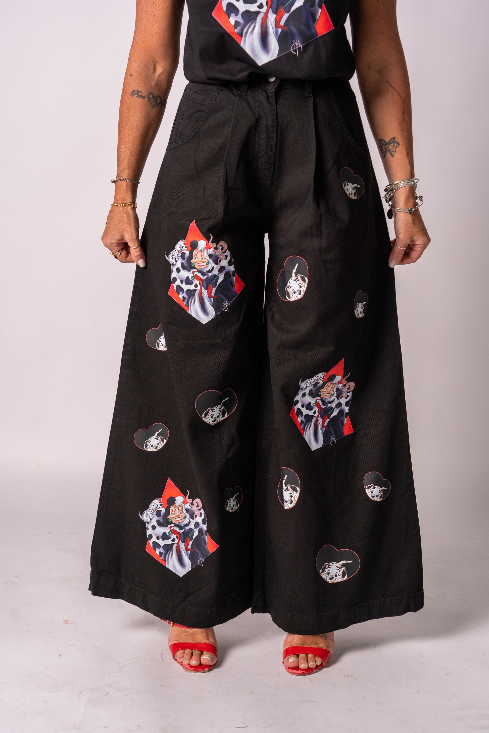 Jeans nero vita alta ,gamba larghissima con stampe CRUDELIA Handemade by Sally!