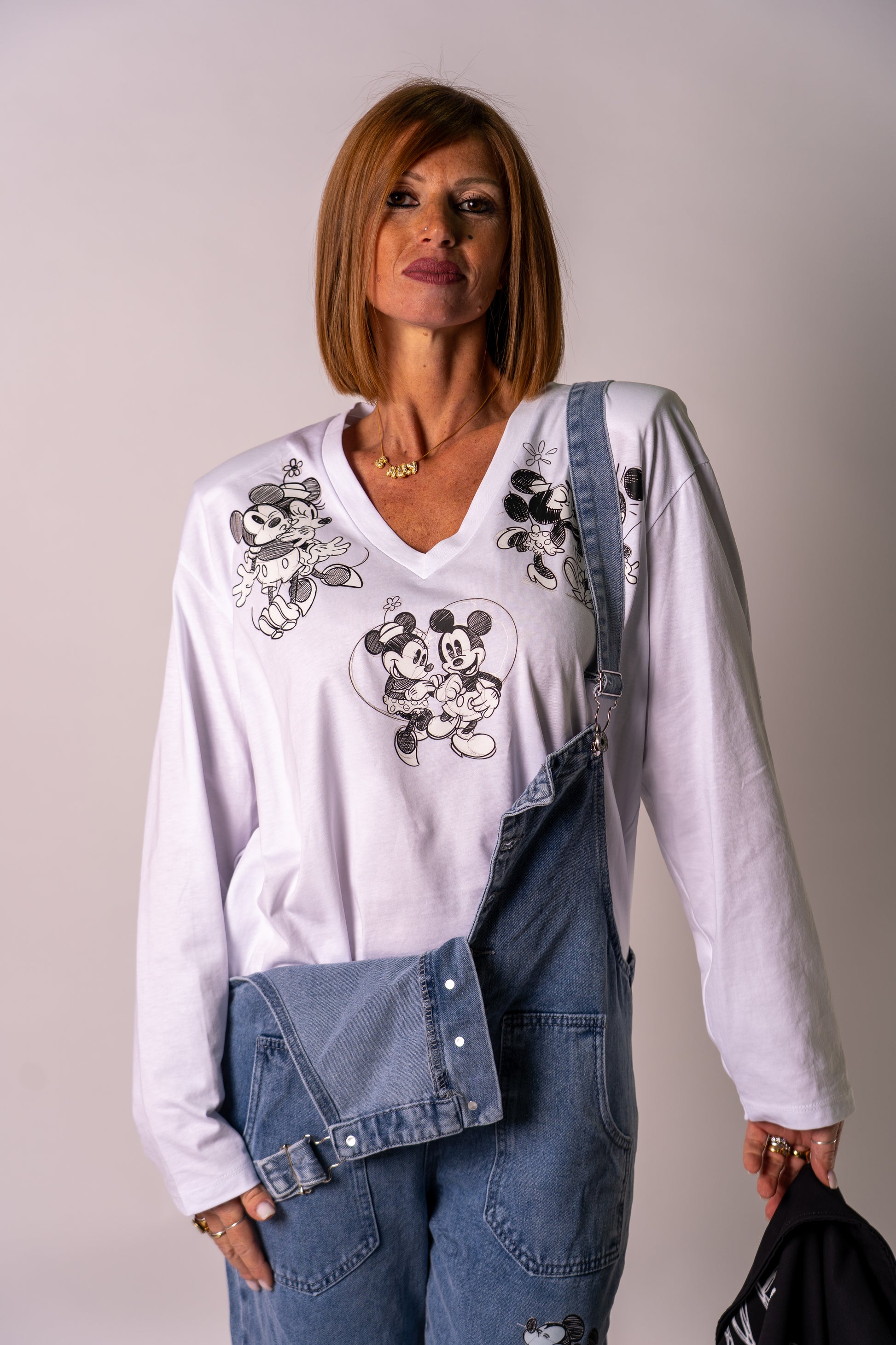 Maglia in cotone con scollo a V e spalline, Stampe Minnie e Topolino handemade by Sally!