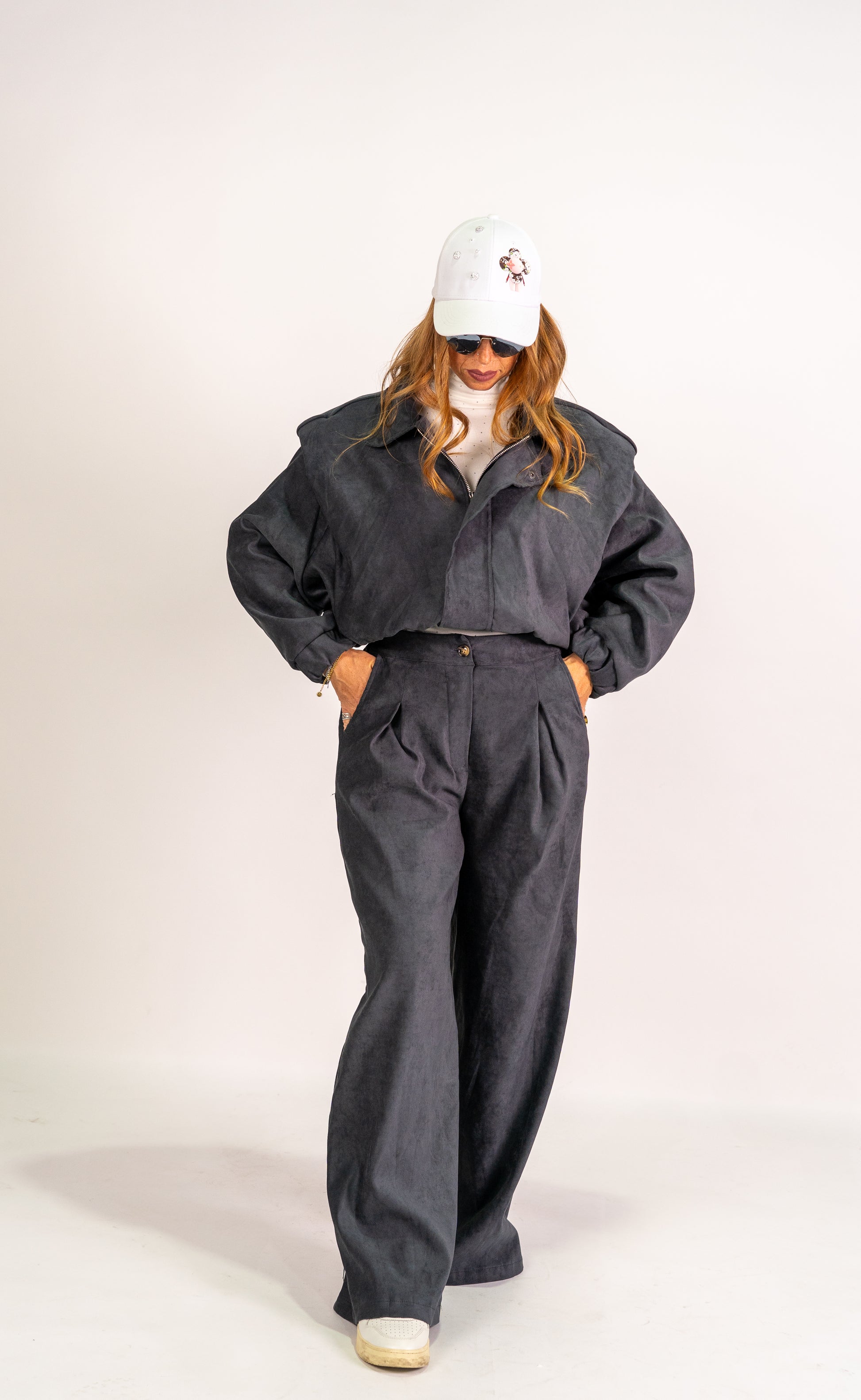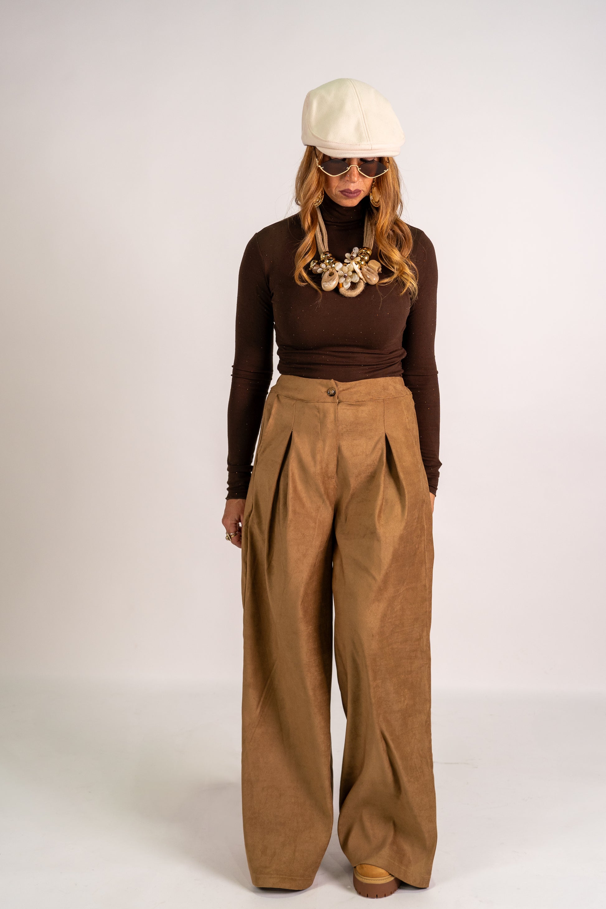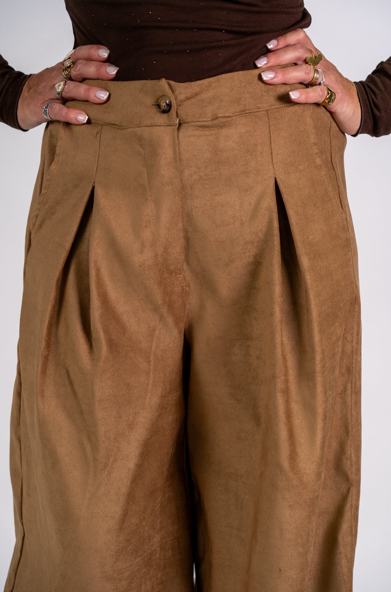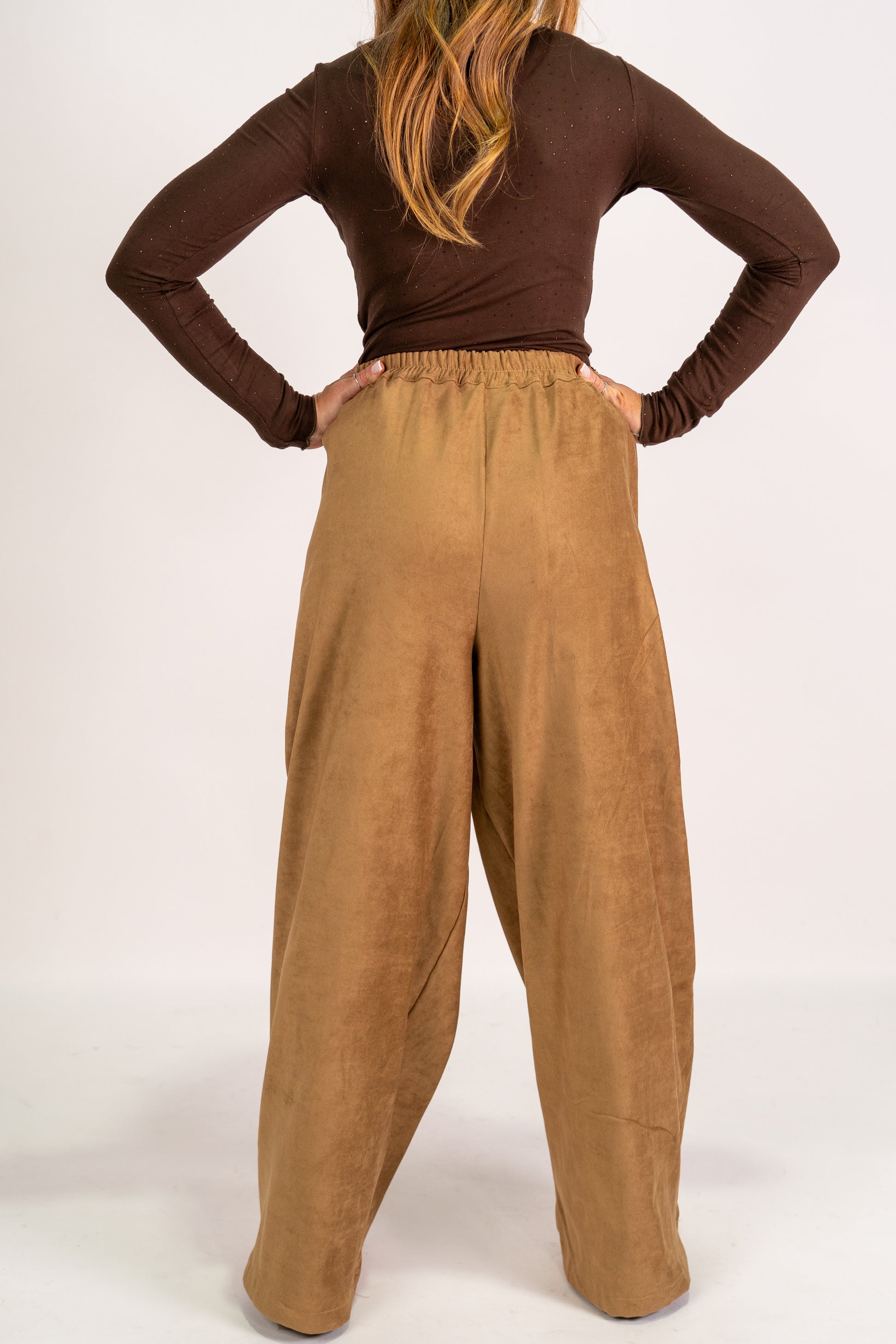 Pantaloni a palazzo in camoscio con elastico sul retro.