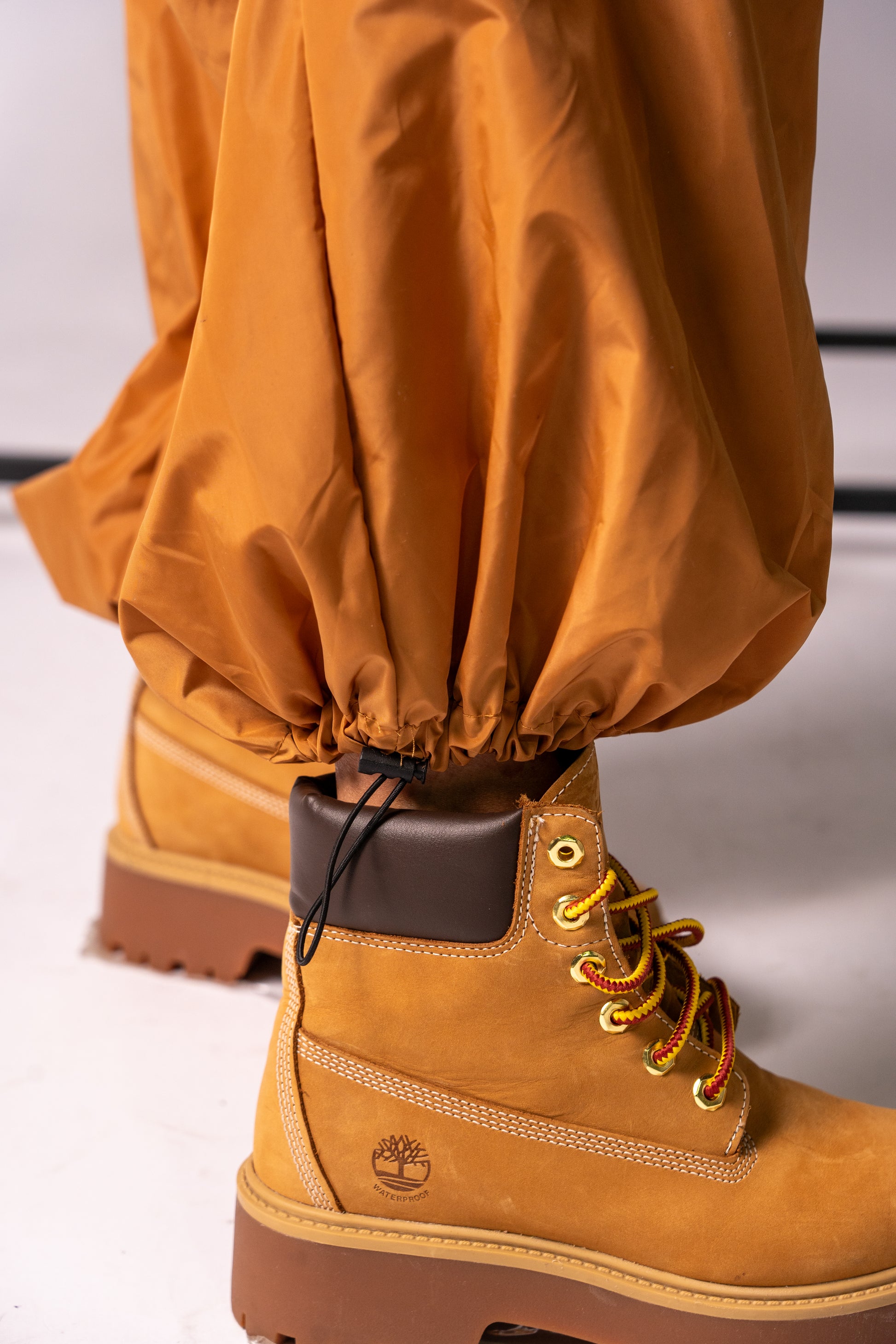 Pantalone con elastico in vita e coulisse alla caviglia.