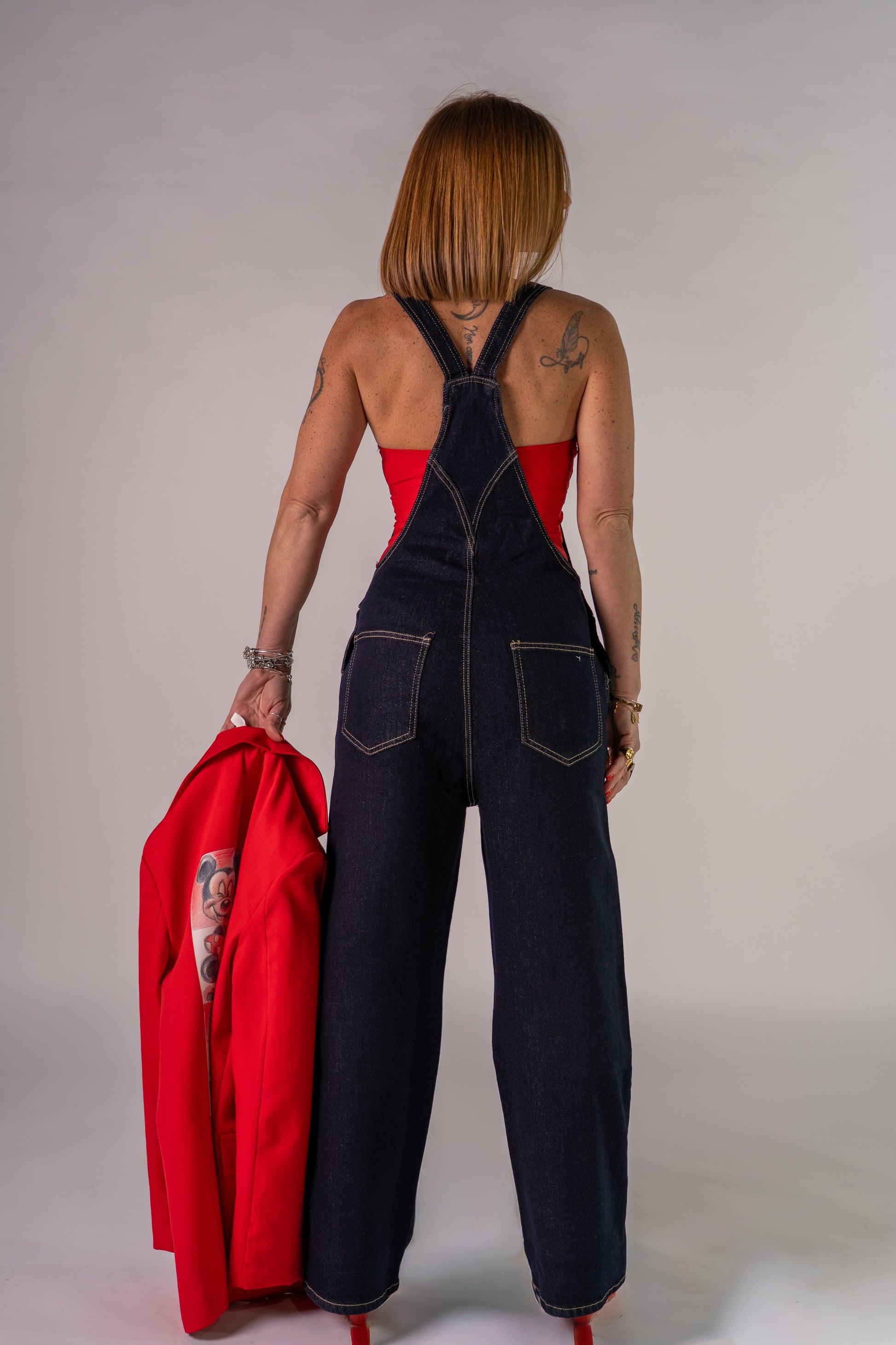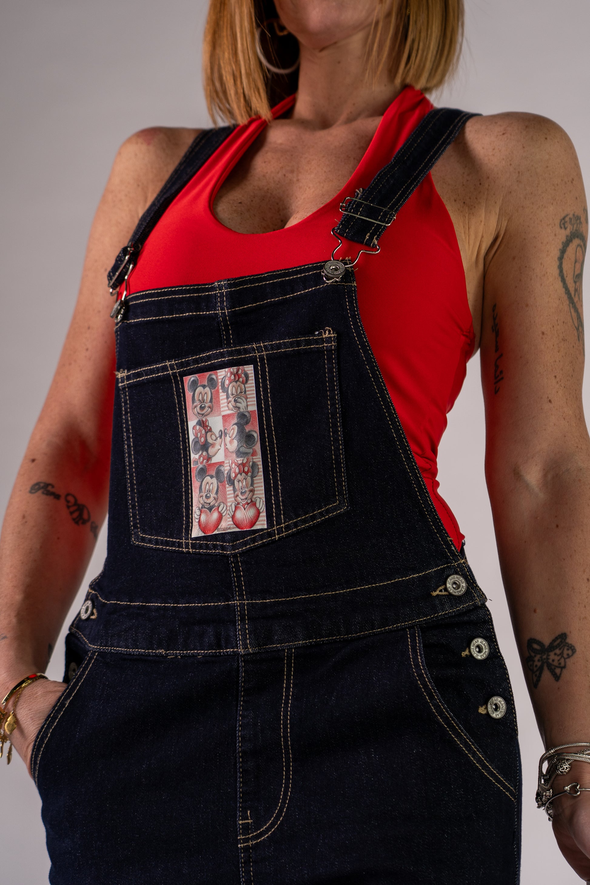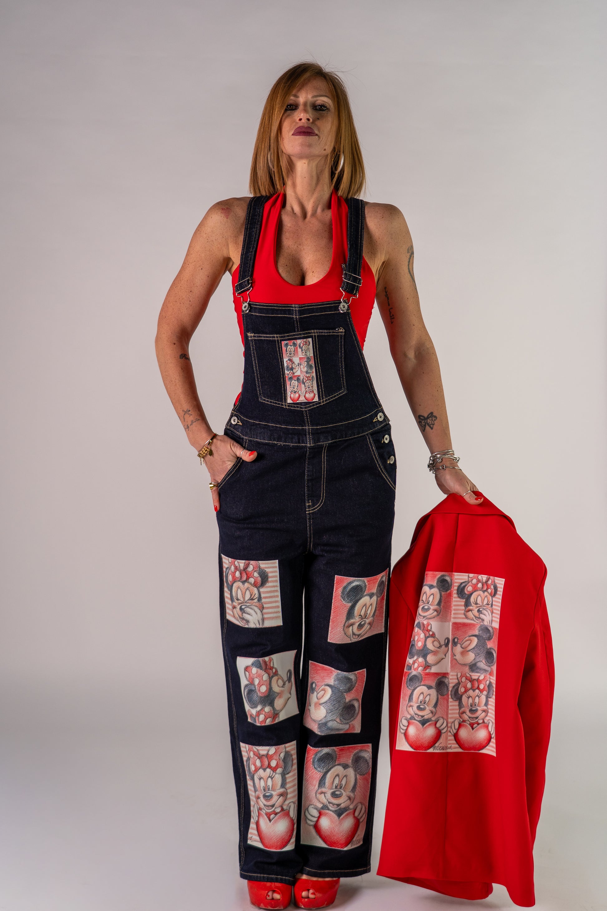 Salopette in jeans elastico ,lavaggio scuro ,gamba dritta e stampe handemade by Sally!