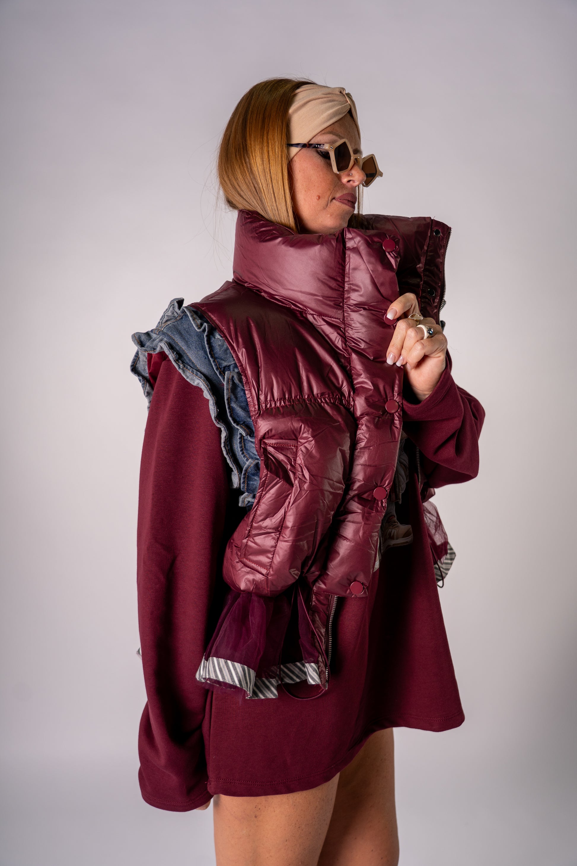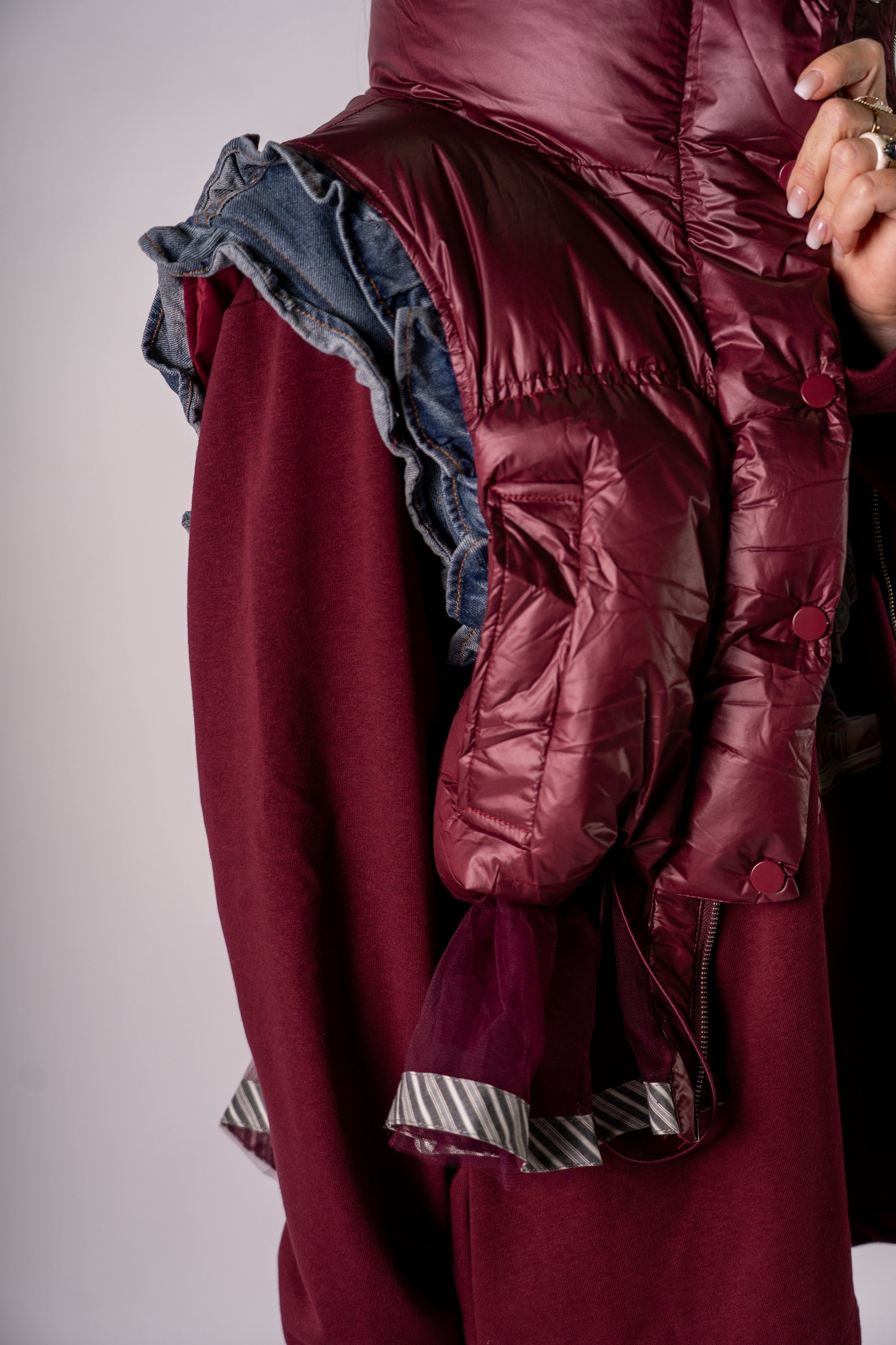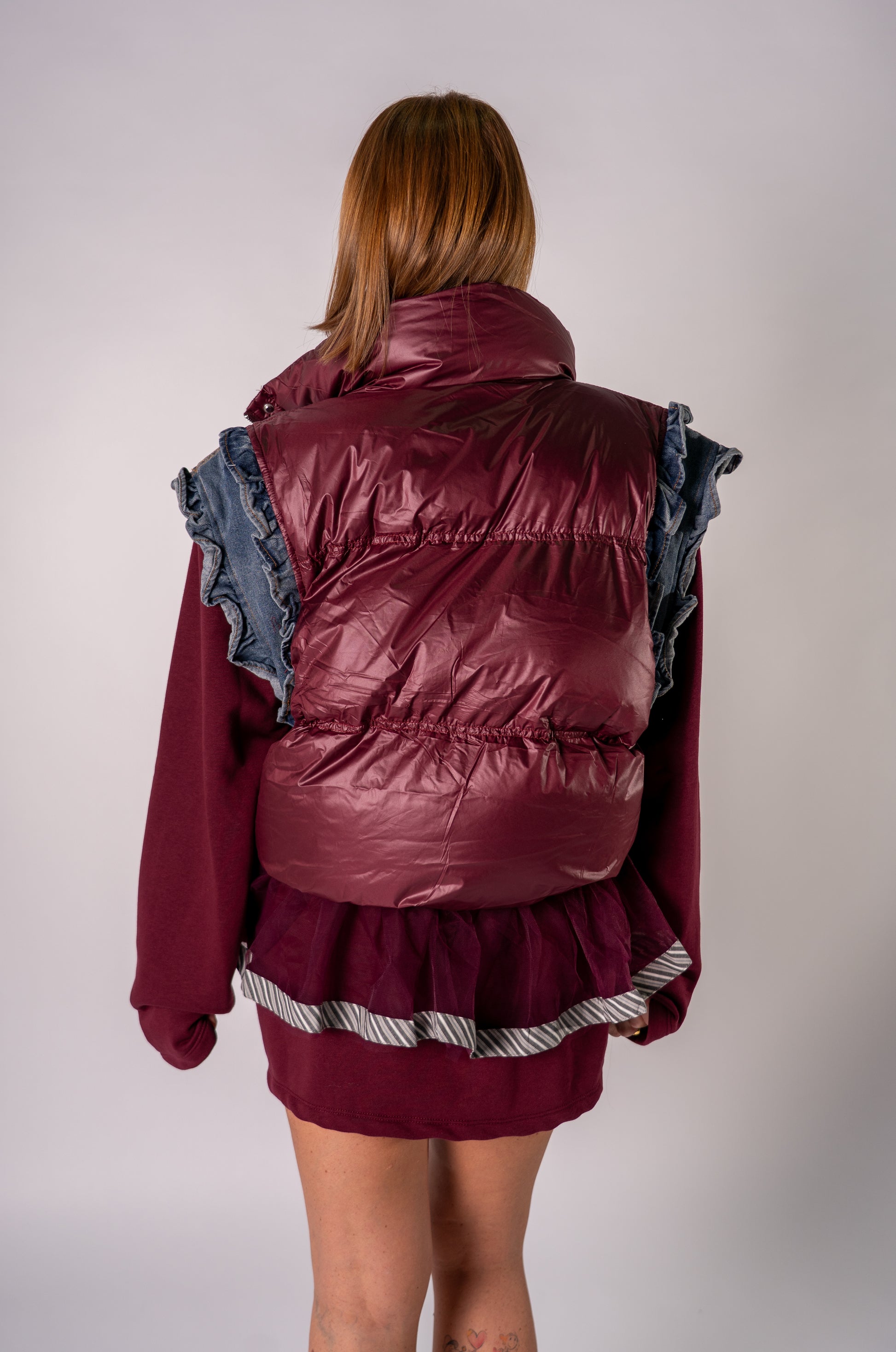 Smanicato imbottito con dettagli in denim alle maniche ,tulle sul fondo e coulisse in vita!