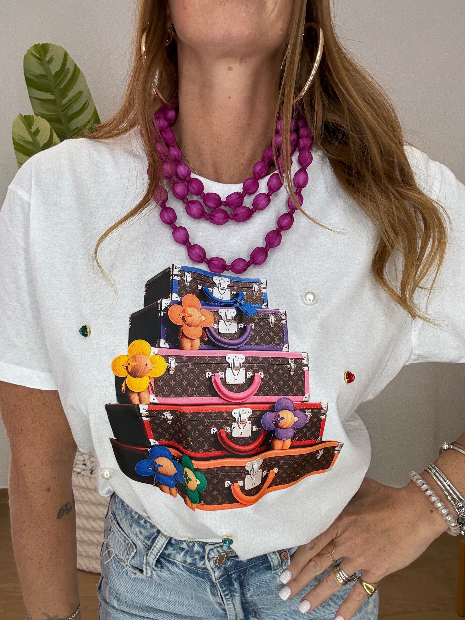 T-shirt in cotone con stampa e decorazioni varie,interamente fatte a mano!
