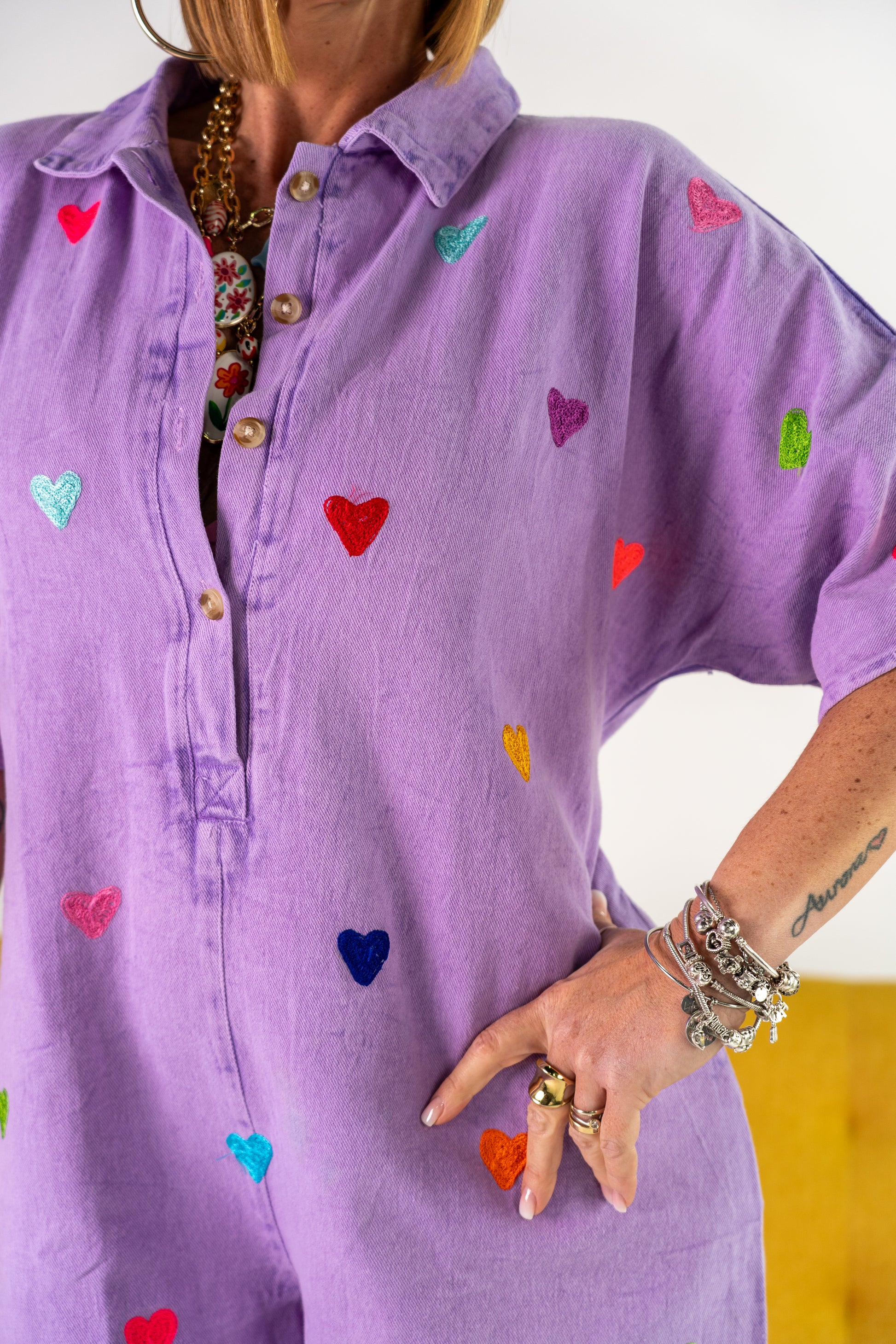 Tutina con bottoni e cintura in vita ,cuori ricamati in vari colori!